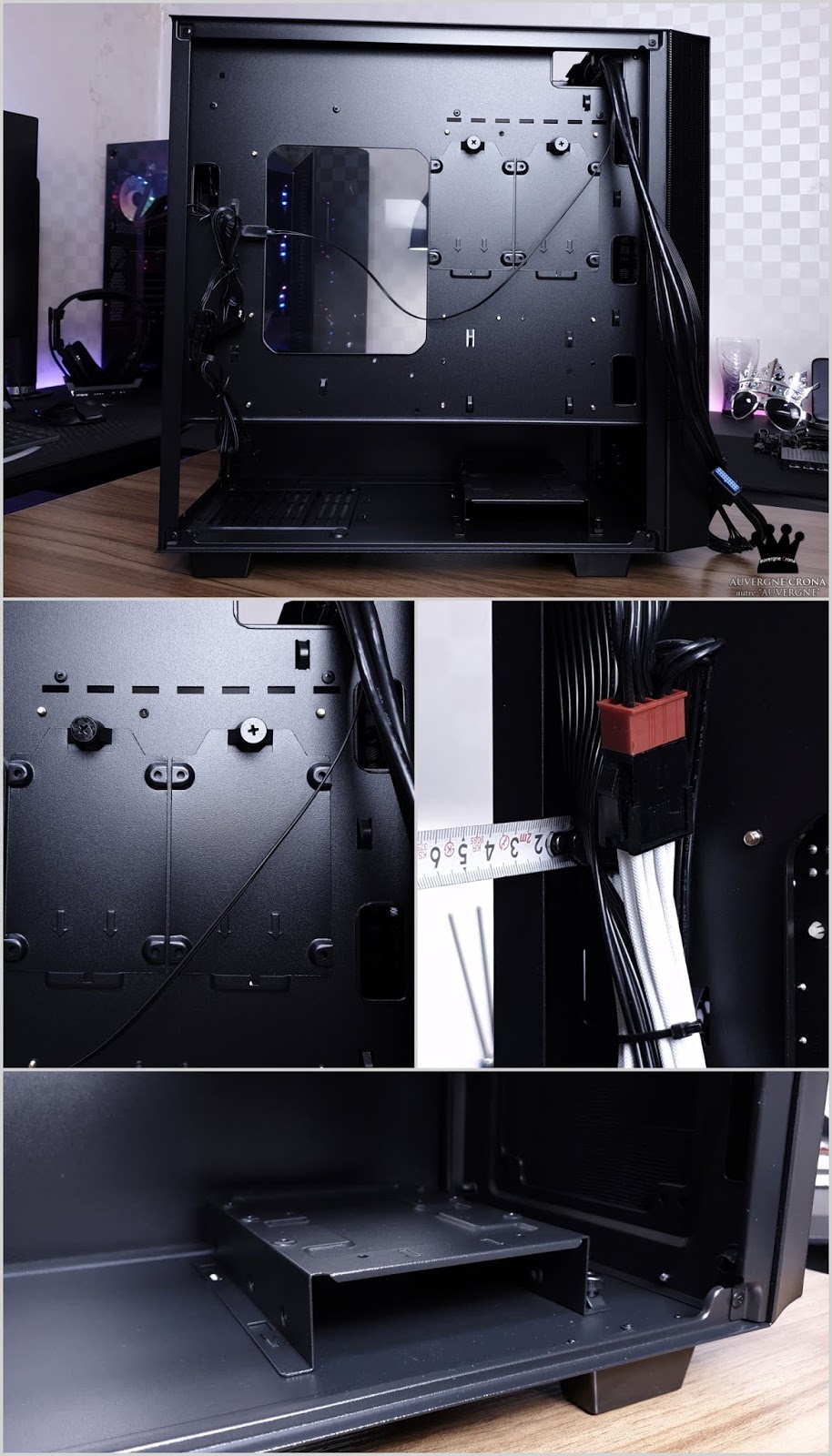 ▲ 내부 레이아웃의 후면은, 무척 깔끔합니다. 좌우측 끝에 케이블 홀을 구성해, 각종 케이블을 사이드에 보기 좋게 정리할 수 있을 것으로 기대되는데요. 저는 선 정리를 참 못하는 편이라, 후면의 선 정리 공간이 넉넉한 제품을 선호하는데, DLV22는 약 1.7cm로, 넉넉한 정도라고 볼 수 있습니다. 하단에는 탈부착이 가능한 드라이브 베이가 설치되어 있네요.