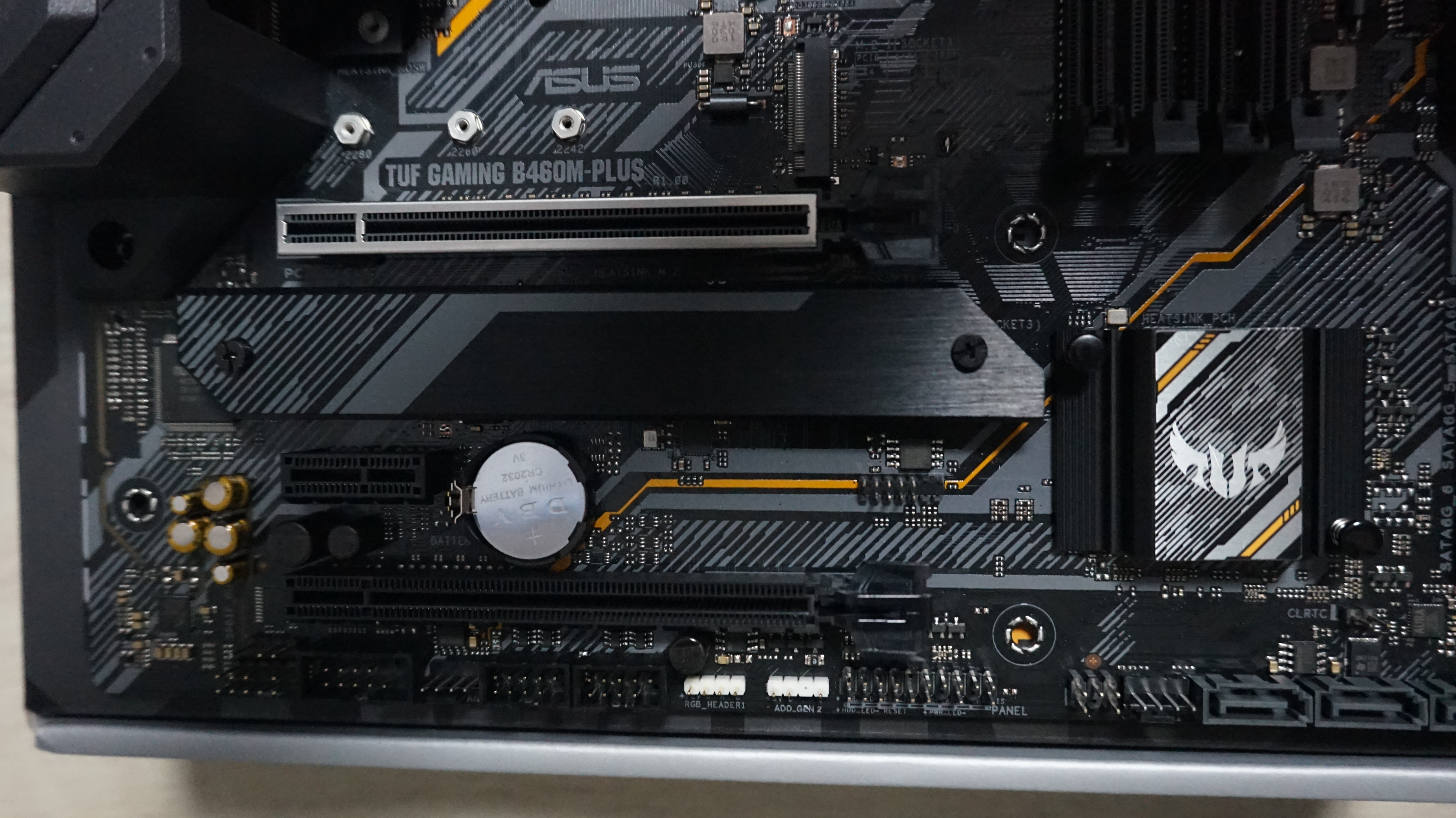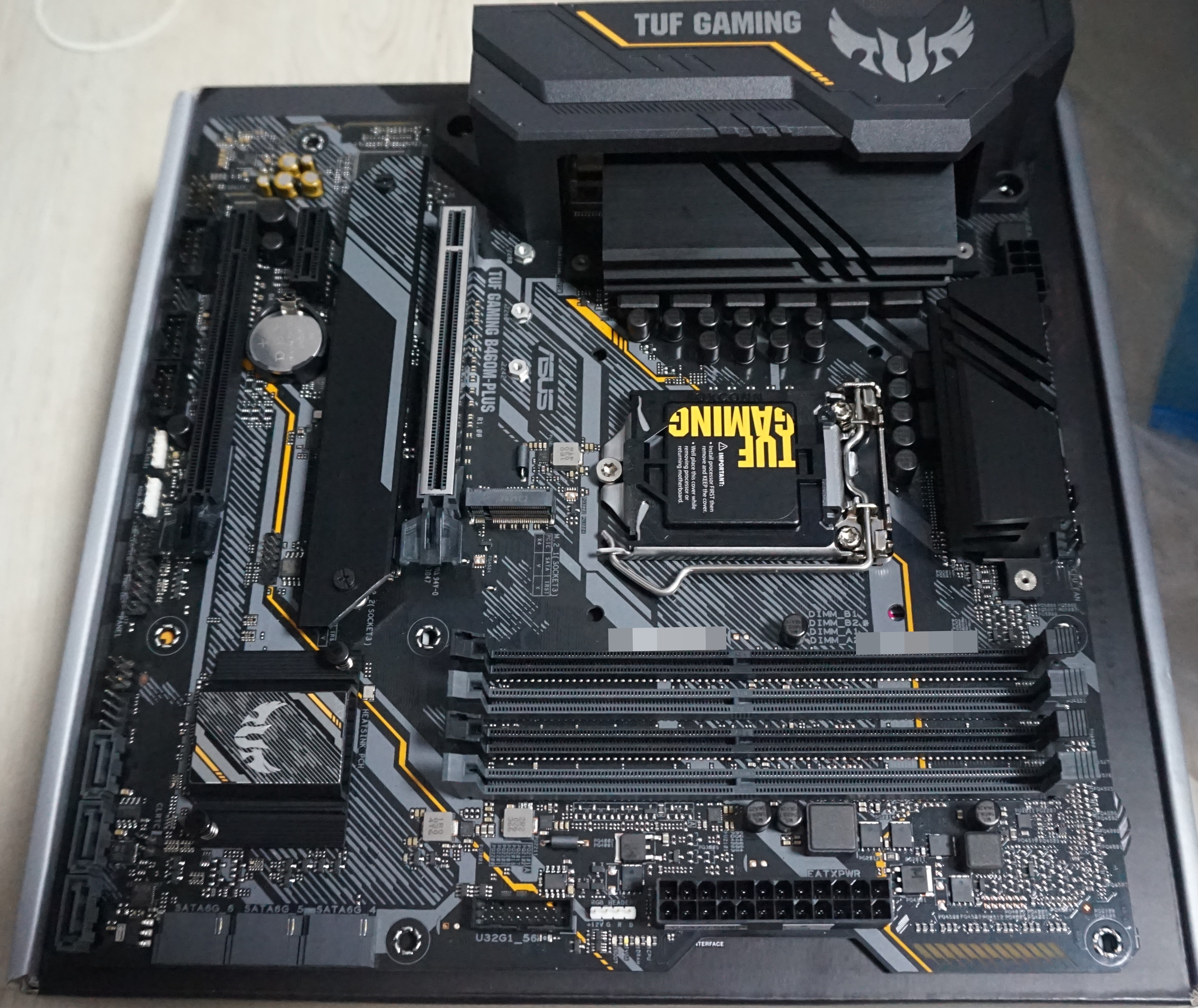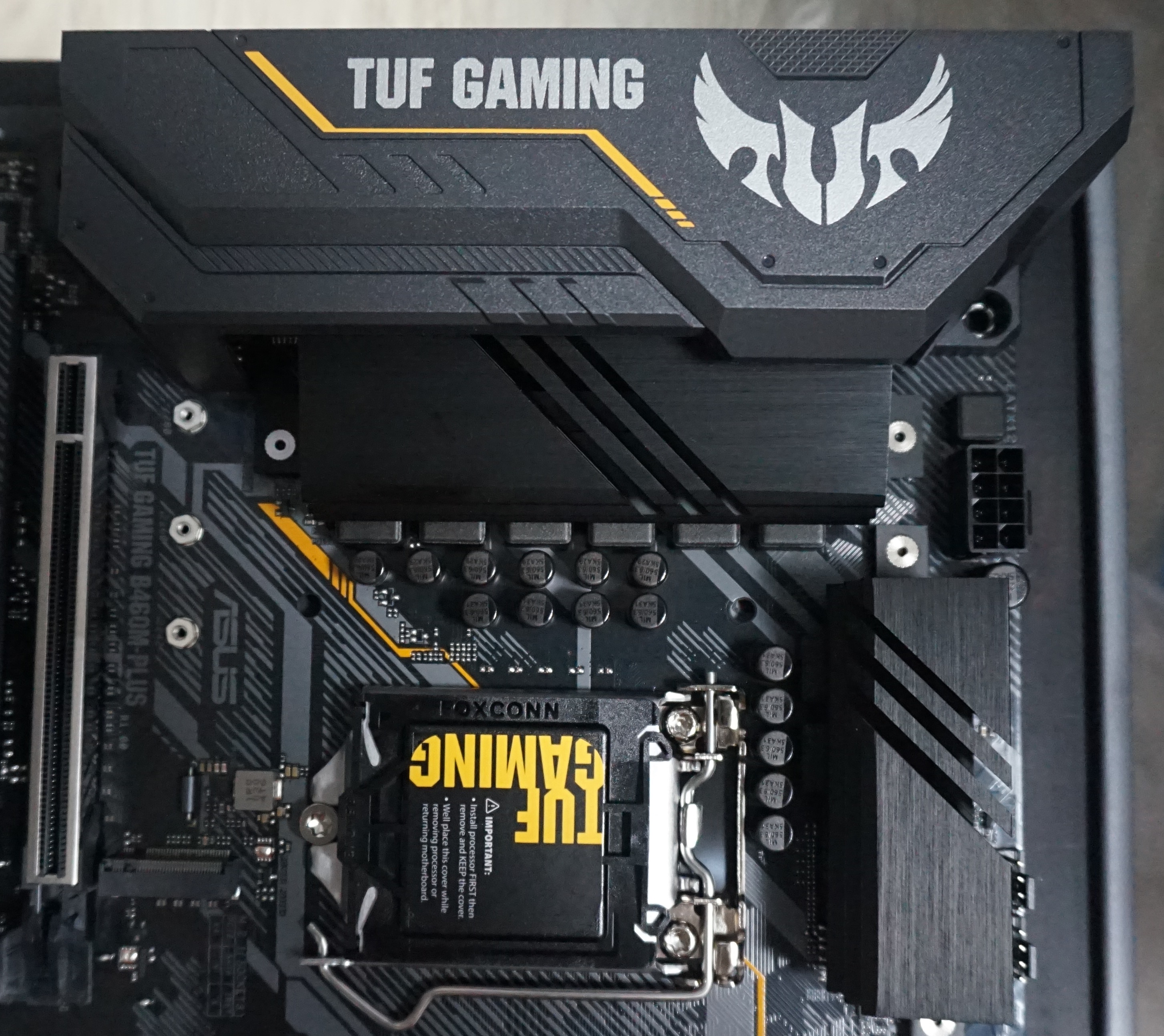 'ASUS TUF Gaming B460M-PLUS STCOM' 에는 사진에서 보시다시피 큼직한 방열판들을 볼수 있습니다. VRM 히트싱크, 서멀패드, M.2 히트싱크 등을 볼수 있습니다. 이러한 디자인 덕분에 효과적인 쿨링으로 내부부품들의 발열을 효과적으로 억제 합니다.