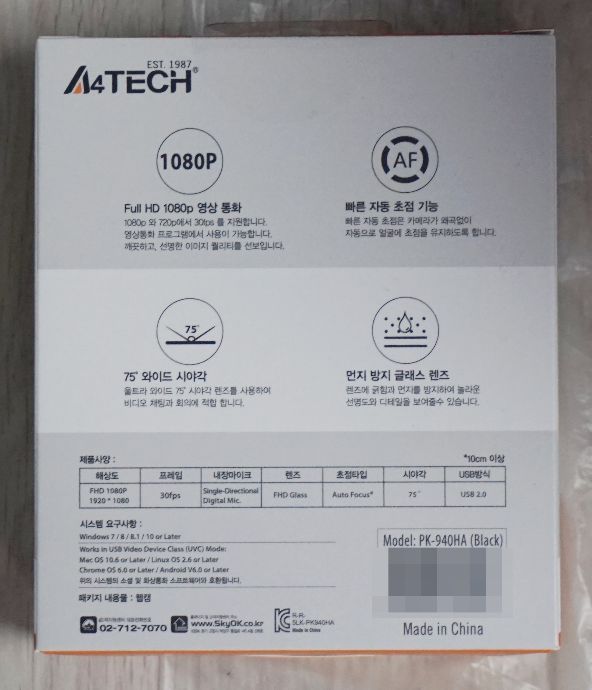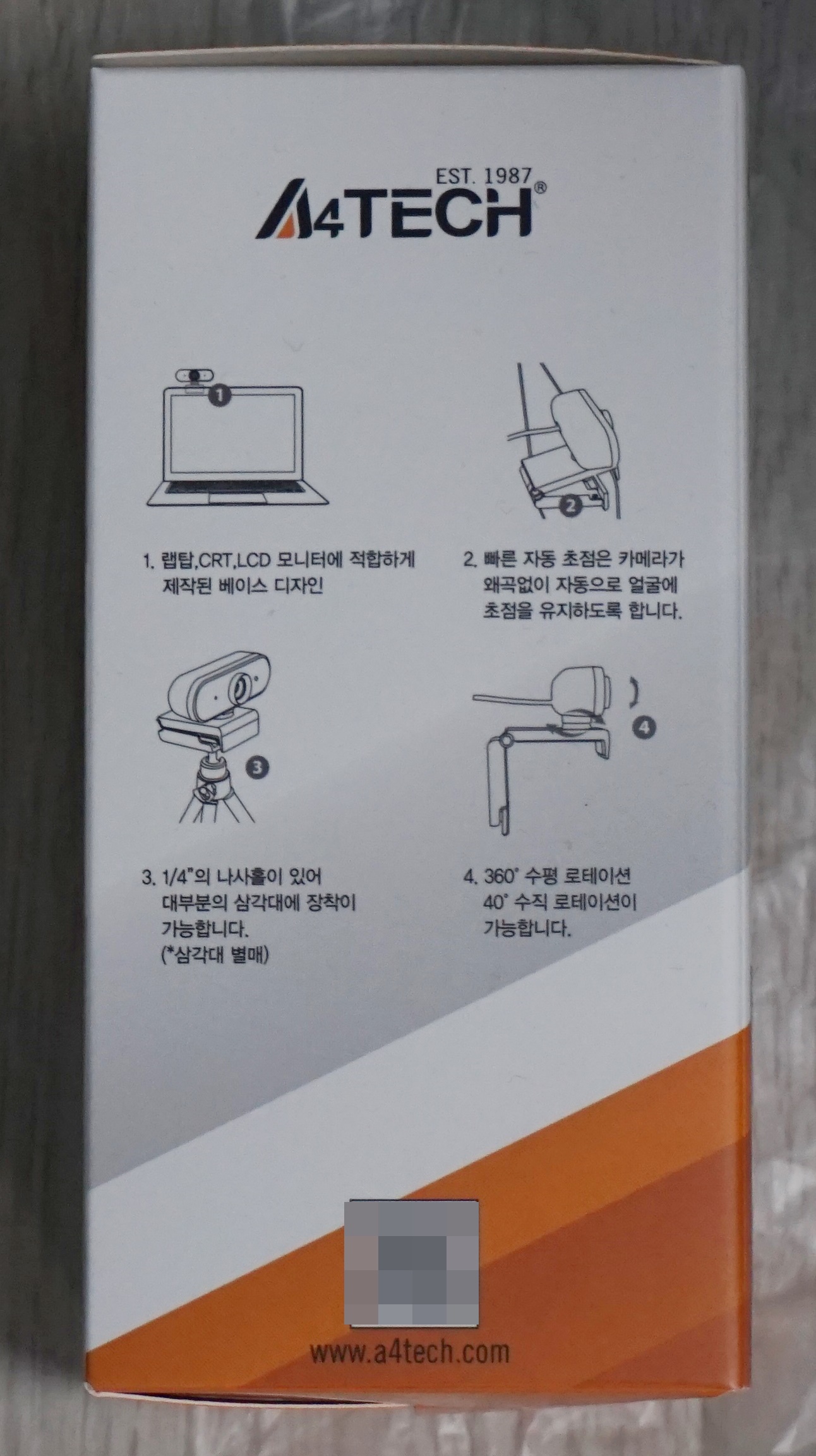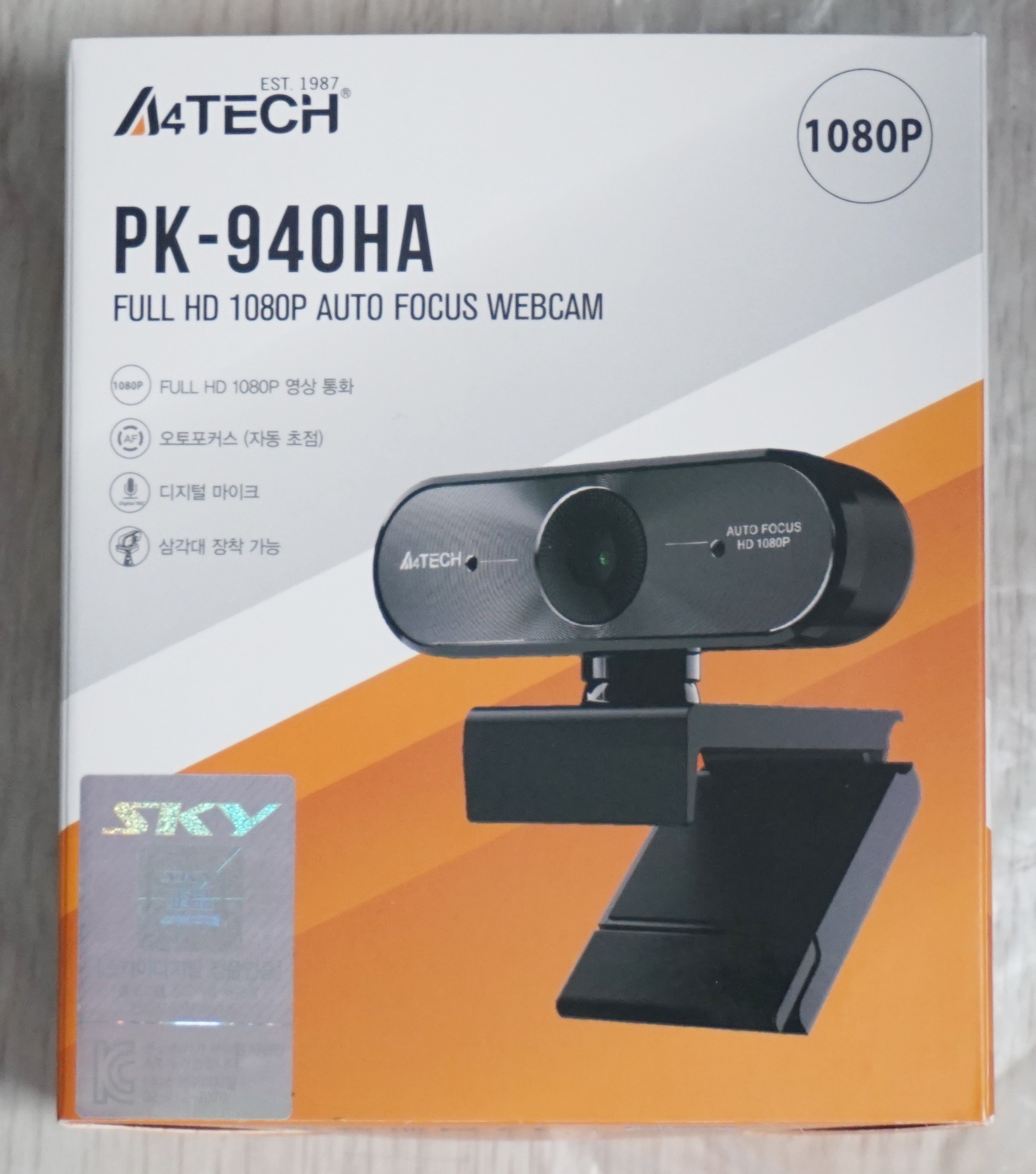 '스카이디지탈 A4TECH PK-940HA' 의 제품박스는 웹캠 크기만한 아담 사이즈에 주황색과 흰색 및 회색을 적절히 섞었습니다. 제품의 실제 사진과 각종 특징들을 표기하고 있습니다. 정품 스티커를 박스에 부착해 놓은 것을 확인할수 있습니다.
