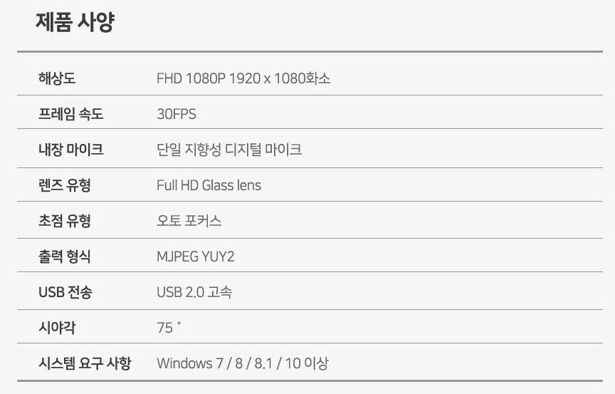 기본 사양을 보게 되면 FHD 1080P 지원에 30FPS, 단일 지향성 디지털 마이크, Full Glass Lens, 오토 포커스, 오토 포커스, MJPEG YUY2 , USB 2.0, 75도 시야각을 가진 것을 확인할수 있습니다.