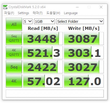 공식스펙인 읽기 3,400MB/s, 쓰기 3,000MB/s 보다 소폭 높게 측정되었습니다.