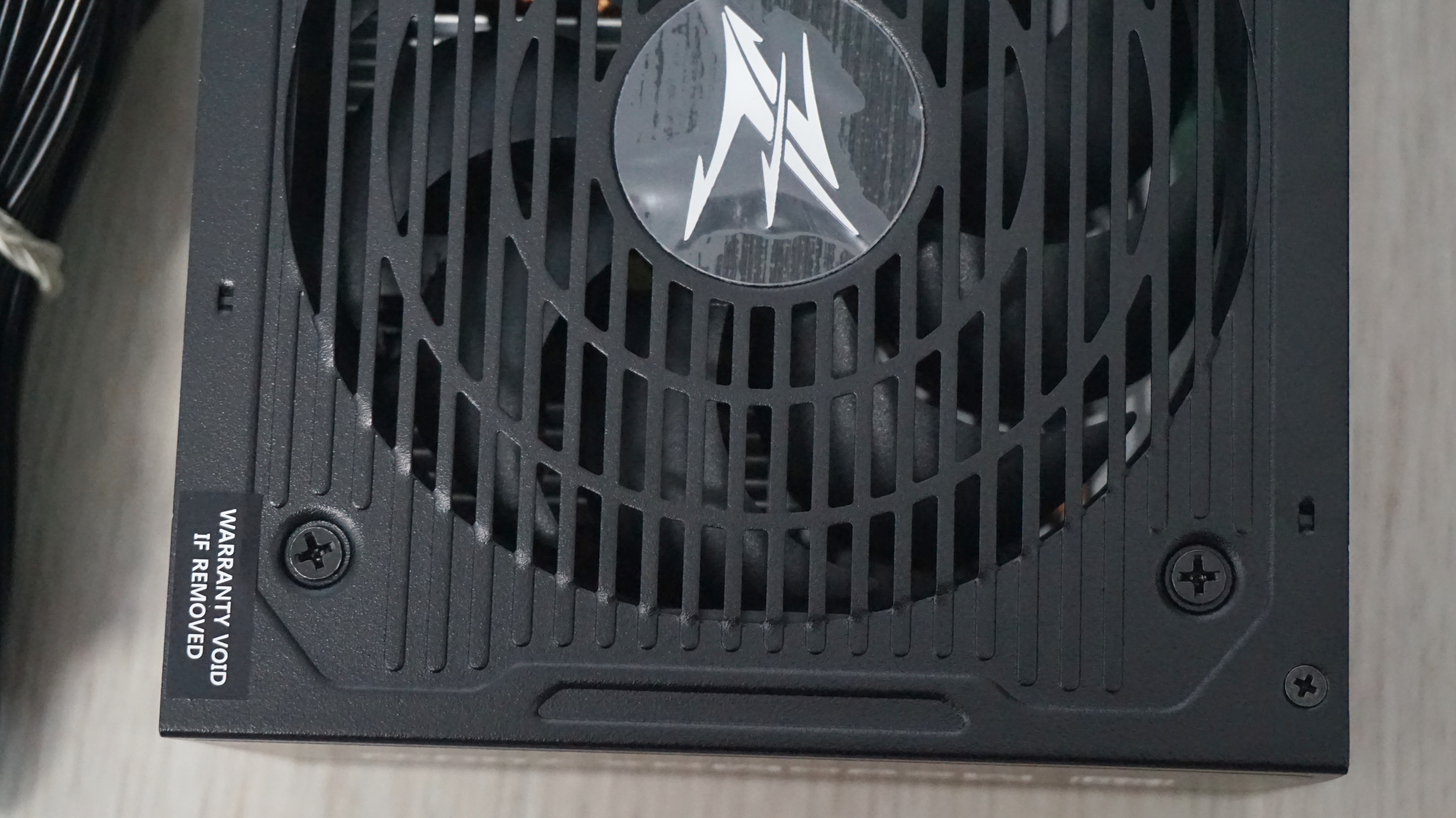 블랙도장에 팬그릴은 없는 형태 입니다. 팬 정중앙에는 로고가 있습니다. 허니컴 타공망을 볼수가 있고, 측면에는 제품명과 제조사 로고 그리고 80플러스 인증을 볼수 있습니다. 밑면에는 제품의 간략한 스펙과 기타 정보를 볼수 있습니다.