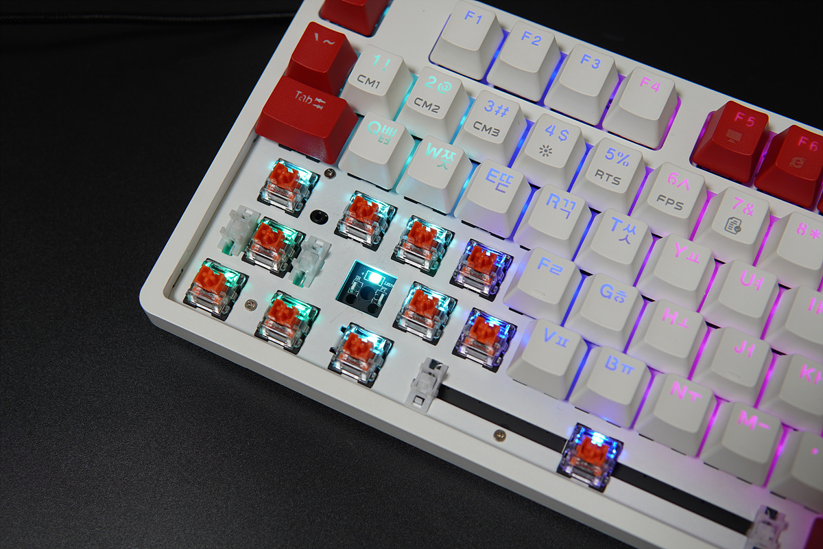 MANIC X50처럼 스위치 교환 방식으로 되어있는 키보드의 LED는 기판에 장착되는 SMD 타입으로 스위치에 LED가 장착된 제품에 비해 광량이 조금 약한 편입니다.