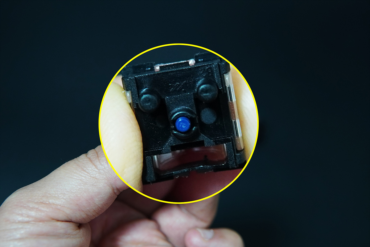 광센서 윗부분에는 SMD 방식의 LED가 있습니다. 스위치의 하우징이 투명하긴 하지만 아무래도 스위치, 키캡을 투과하다 보니 광량은 그리 강하지 않습니다.