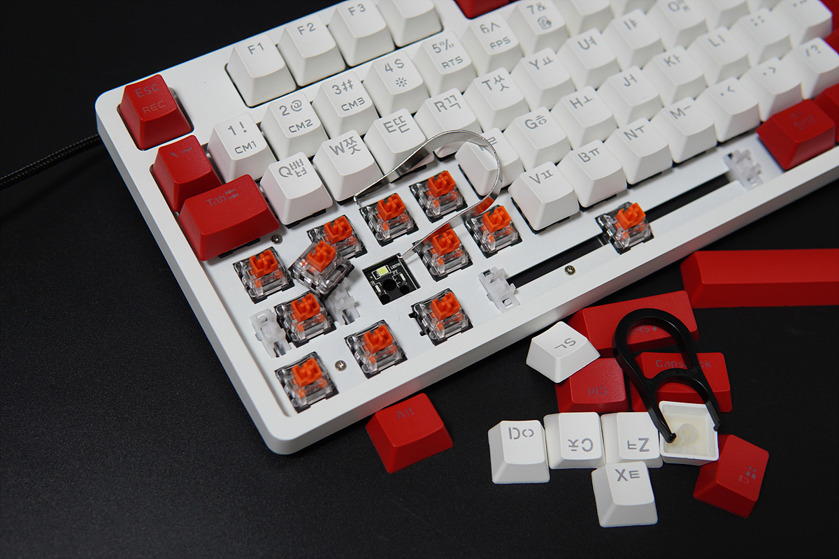 화이트 하우징과 글자(text) 키캡은 모두 화이트로 되어있으며 모디 열만 빨간색으로 포인트를 주고 있습니다. 화이트 계열을 좋아해서 그런지 디자인은 마음에 들었습니다.