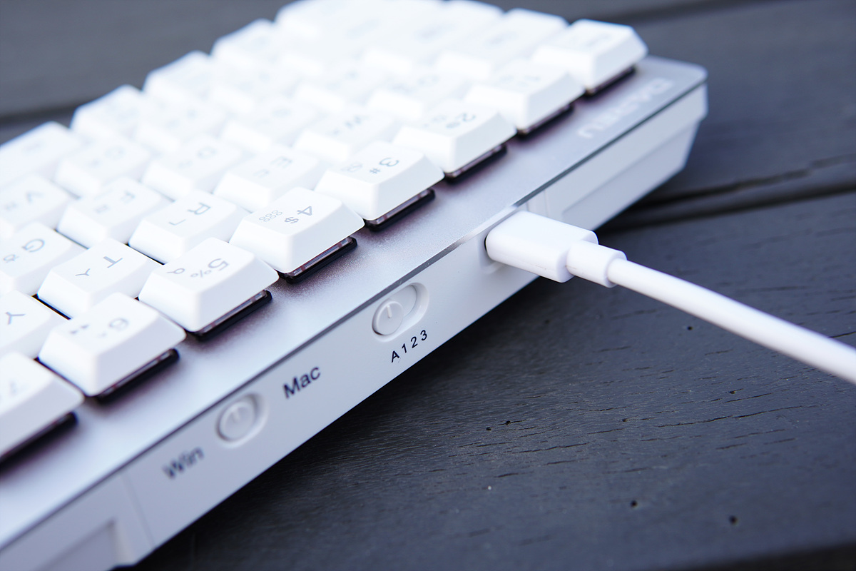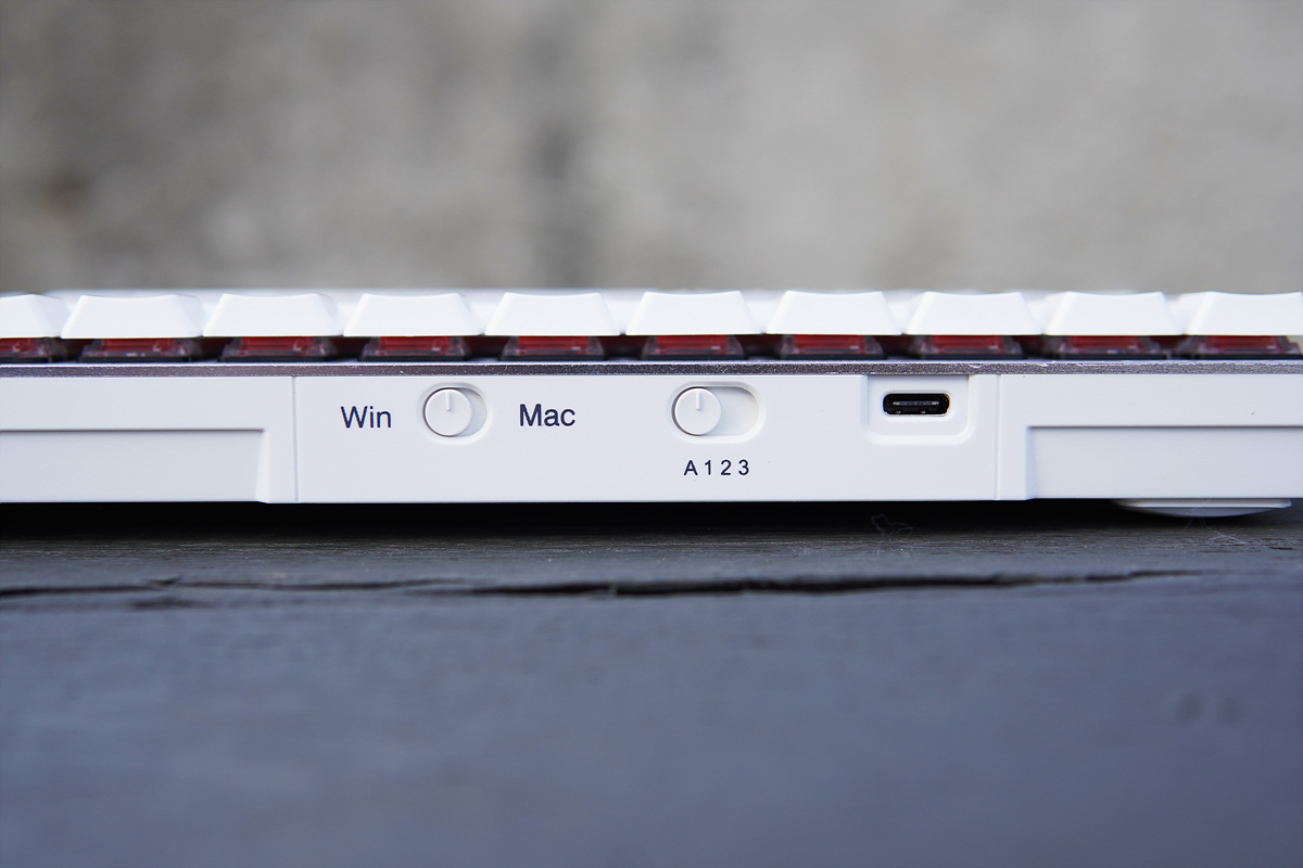 사용자를 기준으로 위쪽 측면에는 모드 변경을 할 수 있는 두 개의 스위치가 있으며 유선 모드와 배터리를 충전할 수 있는 Type-C 포트가 있습니다. 케이블을 연결하고 A모드로 선택을 하면 유선으로 연결할 수 있으며 자동으로 충전이 이루어집니다. Win / Mac은 키보드 배열과 단축키를 설정하는 부분이 달라지게 됩니다. 유선과 무선(블루투스)으로 연결할 수 있는 부분도 좋지만 Windows와 Mac를 선택할 수 있는 부분 역시 상당히 맘에 들었습니다.