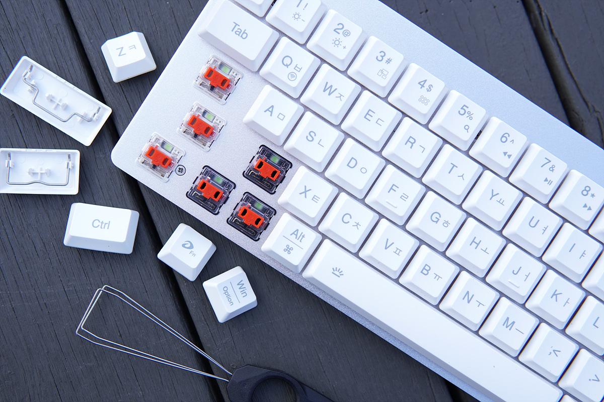 알루미늄 상판에 화이트 계열이라 디자인은 확실히 좋은 모습이었습니다. 추가적으로 LP 스위치는 키캡을 바꾸는게 거의 불가능하기 때문에 더더욱 만족스러운 부분이었습니다.