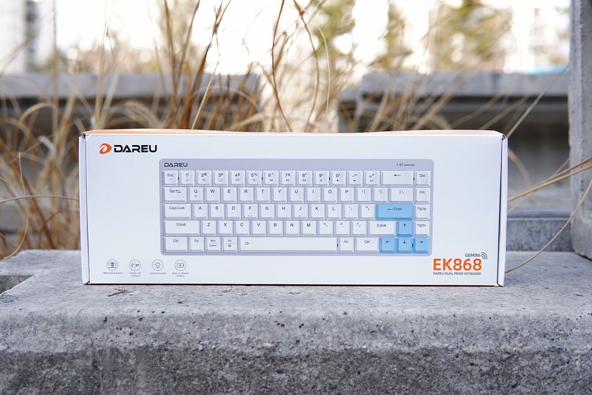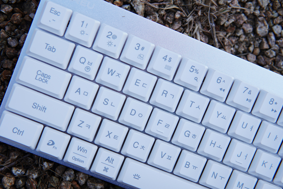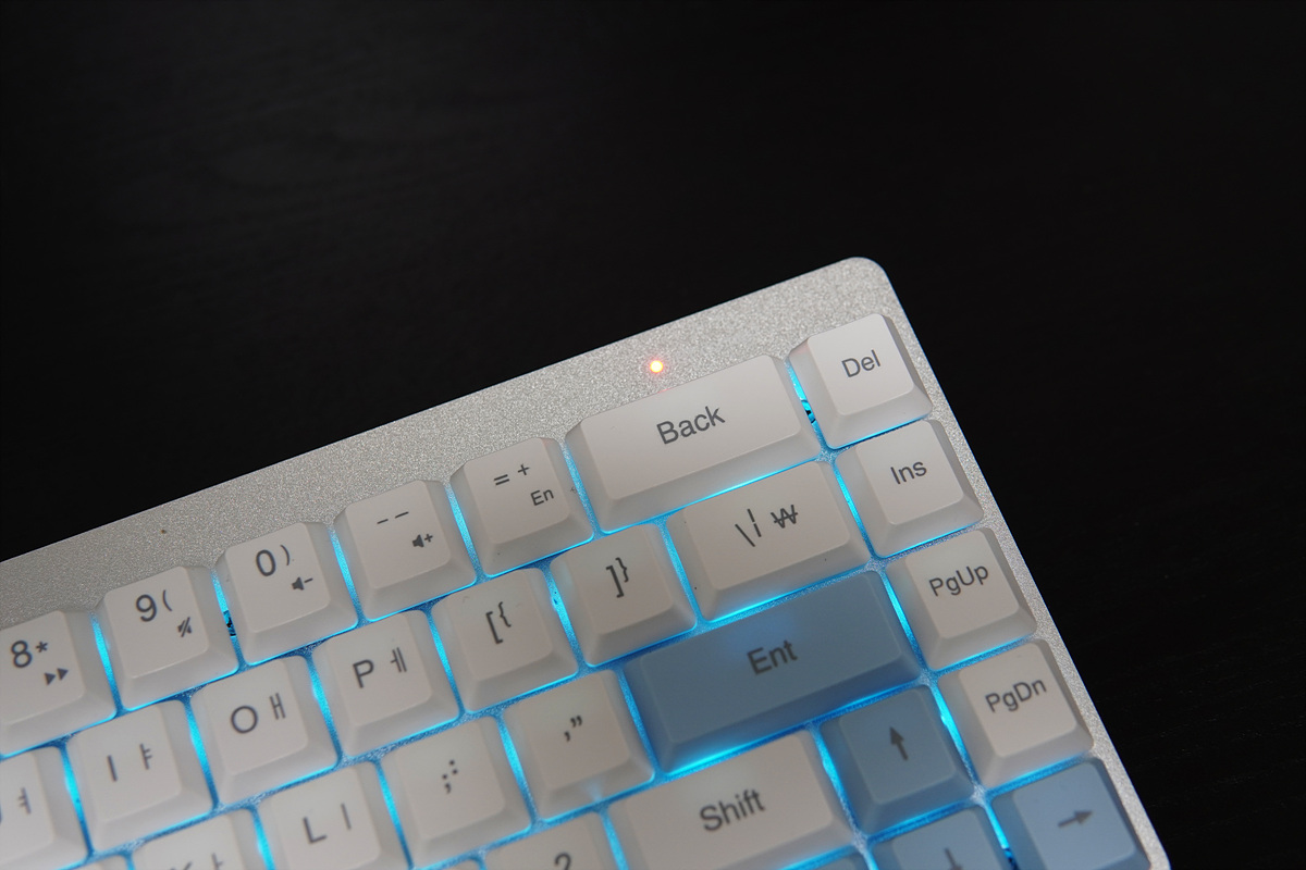 EK868 키보드의 첫인상은 상당히 좋았습니다. 알루미늄 상판에 화이트 키캡이 깔끔한 인상을 주었으며 엔터키와 방향키는 파란색으로 포인트를 주고 있습니다.