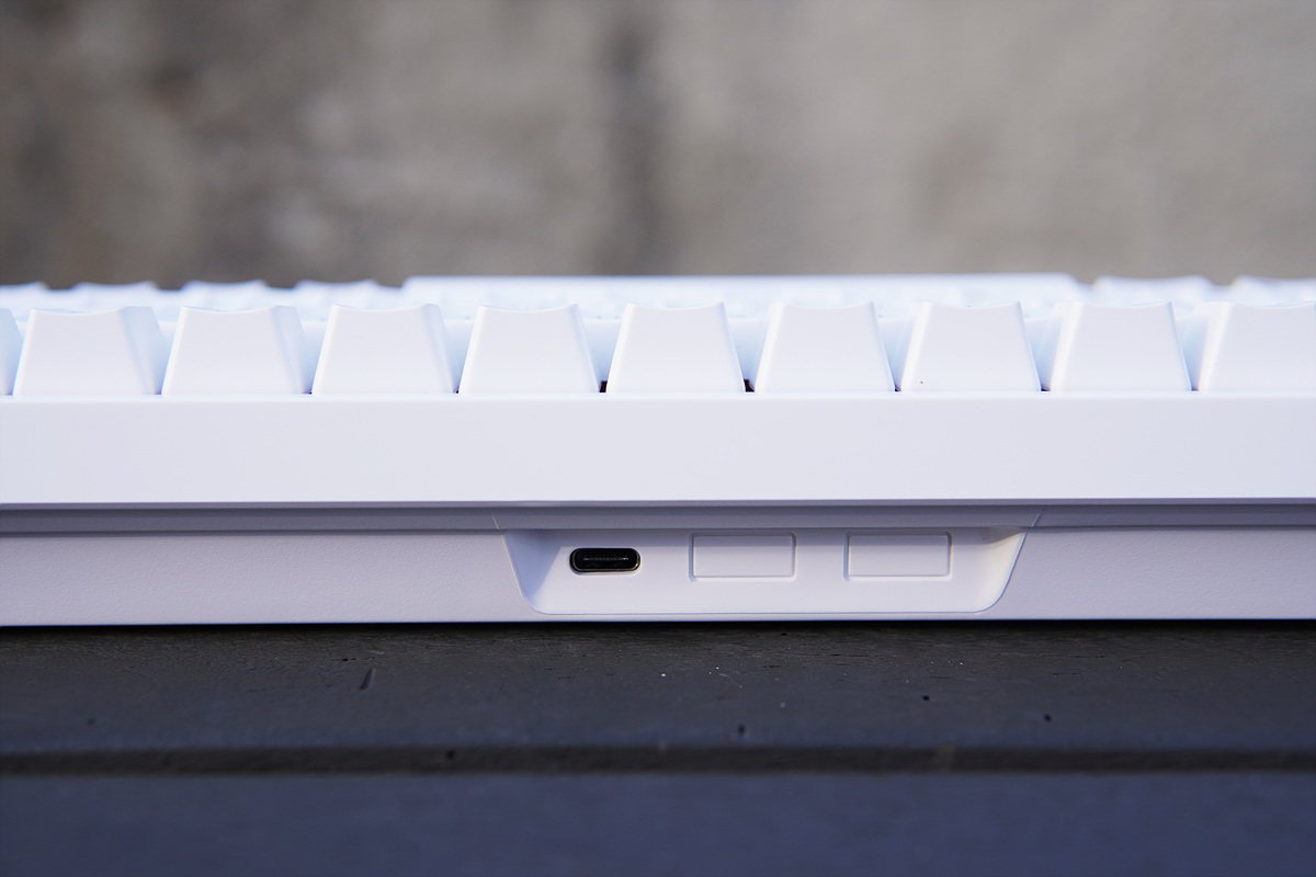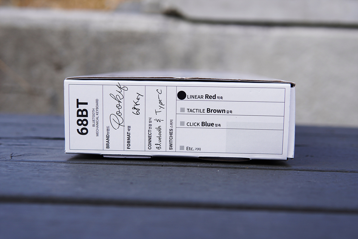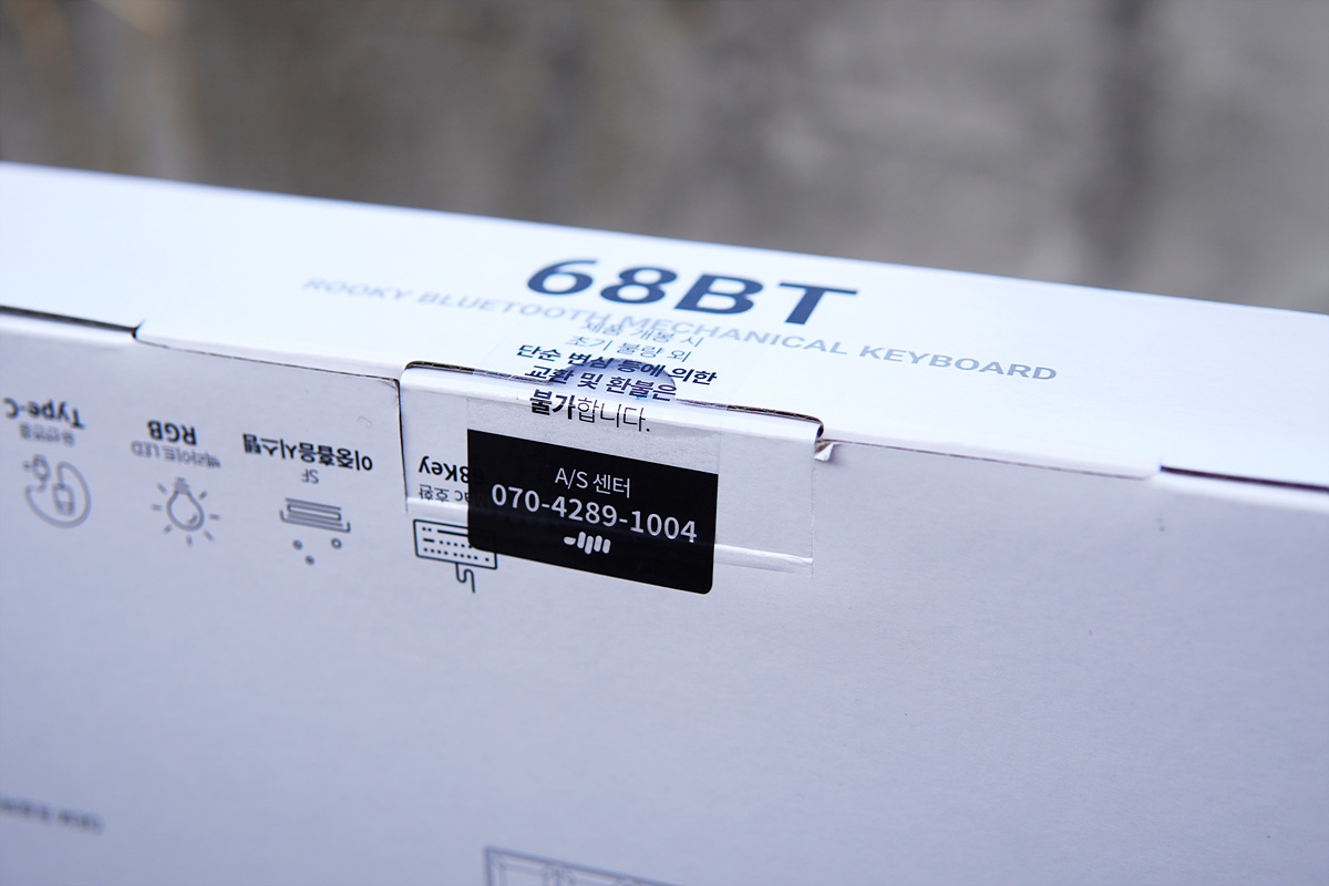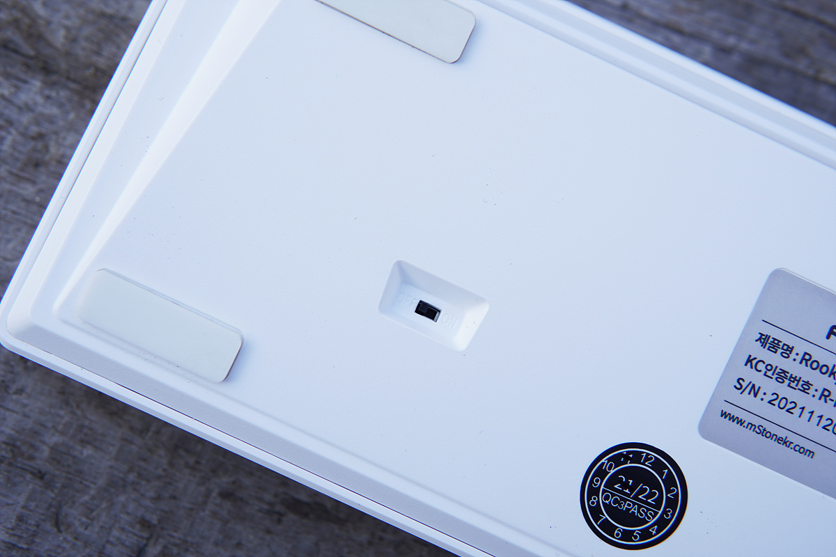 바닥면에는 On / Off 스위치가 있습니다. Rooky 68BT는 유선과 무선을 모두 지원하고 있습니다. 블루투스 방식으로 사용할 때는 전원을 On으로 해야 하고 유선 모드로 사용할 때는 케이블을 연결한 상태에서 스위치를 Off로 해야 합니다. 개인적으로는 이 스위치가 바닥이 아닌 위쪽이나 측면으로 두는 게 더 좋았을 거라 생각합니다. 유선 / 무선 모드를 자주 바꾸지는 그래도 변경을 할 때마다 키보드를 들어야 하는 게 조금 불편했습니다.