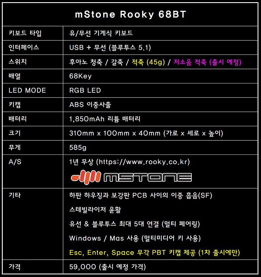 엠스톤 Rooky 68BT 키보드의 스펙을 간단하게 정리했습니다. 그동안 엠스톤 키보드들은 체리 스위치를 주로 사용했었지만 루키 68BT는 후아노社의 스위치를 사용했습니다. 가격을 좀 더 낮추기 위한 선택이라 생각됩니다. 이번 달에 출시 예정이며 가격은 59,000원으로 68 키 + 블루투스 + 기계식 키보드중에서는 가장 낮은 가격입니다.