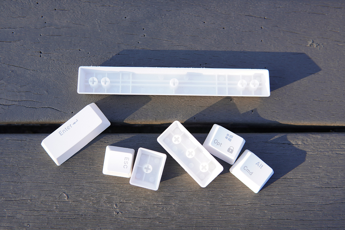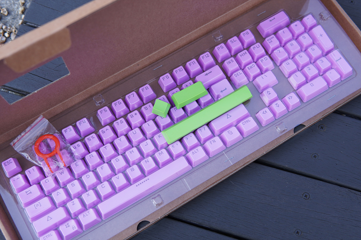 1차 출시에만 제공되는 3개의(Esc, Enter, Space) 포인트 키캡입니다. 포인트 키캡은 PBT 재질로 각인이 없는 무각으로 되어있습니다. 추가로 제공되는 키캡인데도 PBT 재질이라 더욱 좋았습니다.