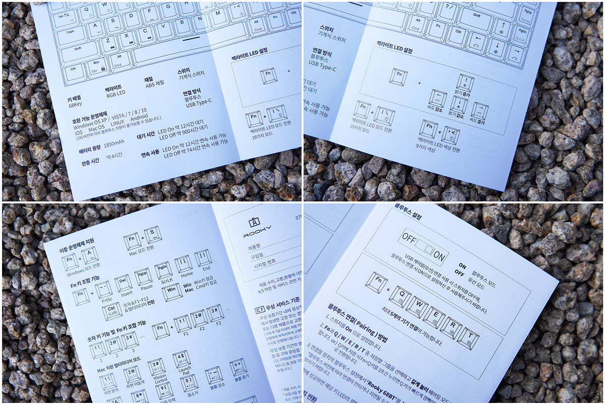 루키 68BT는 키 입력뿐 아니라 RGB LED 모드와 여러 가지 기능이 제법 많습니다. 미니 배열이 익숙한 분들이라면 괜찮겠지만 처음 사용하는 분들이라면 꼭 설명서를 확인해보시기 바랍니다.