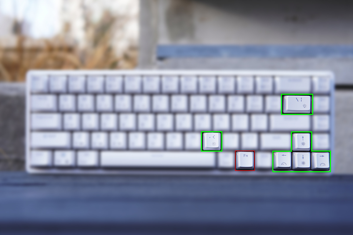 미니 배열의 키보드는 F1 ~ F12까지의 펑션키는 Fn 키와 조합으로 사용하게 됩니다. 보통 미니 배열의 키보드에서는 "` / ~" 두 개의 키 입력은 Esc키에 할당해서 Fn 키와 조합으로 사용하지만 Rooky 68BT는 Esc는 단독으로 사용하며 해당 키는 오른쪽에 따로 배치를 했습니다. 저는 해당 키들을 잘 사용하지 않아서인지 딱히 불편하지는 않았지만 이 부분은 호불호가 나뉠 거 같습니다.