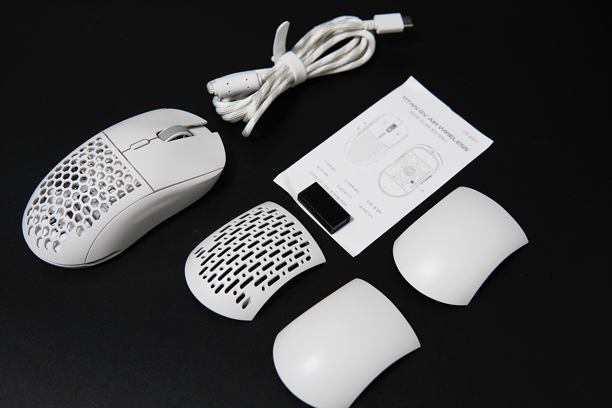 마우스 본체, 파라코드가 적용된 케이블, 설명서, USB C to A 젠더로 이루어져 있으며 TITAN GV AIR의 가장 큰 특징이라고 할 수 있는 교체형 커버가 3개 추가되었습니다.