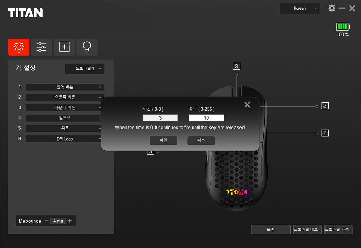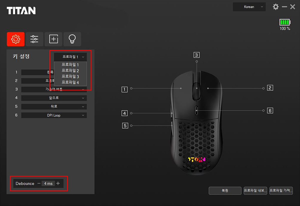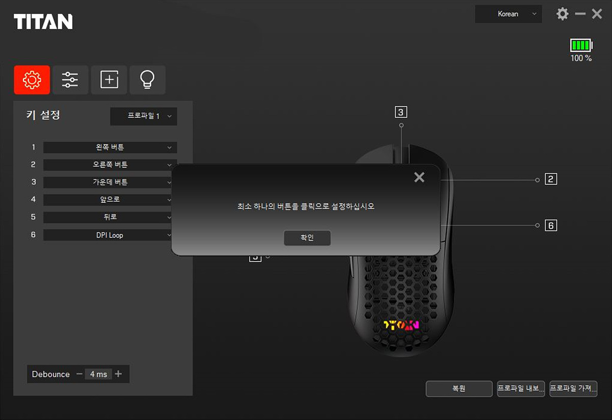 프로파일은 4개까지 지정할 수 있으며 설정된 부분은 파일로 만들어서 내보내기나 다시 불러올 수 있습니다. 왼쪽 아래의 Debounce 기능은 버튼 반응 시간을 조절하는 메뉴로 너무 짧게 할 경우 더블 클릭으로 인식할 수 있으니 이럴 경우는 시간을 조금 더 길게 수정을 해야 합니다.