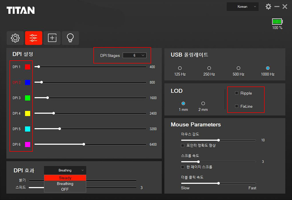 DPI는 기본 1 ~ 6단계로 사용자 임의로 설정이 가능합니다. DPI에 따른 LED 모드는 Steady / Breathing / Off로 선택할 수 있습니다. 저감도 사용자들에게 꼭 필요한 LOD는 2단계로 설정할 수 있습니다. Ripple 기능은 마우스의 수직, 수평을 보정해주는 기능으로 직선보다는 고해상도에서 원을 그릴 때 조금 더 편리하며 FixLine는 직선 보정 기능으로 선을 그릴 때 편리하게 사용할 수 있습니다. fps와 같은 게임에서는 FixLine을 꼭 해제하고 사용하세요.