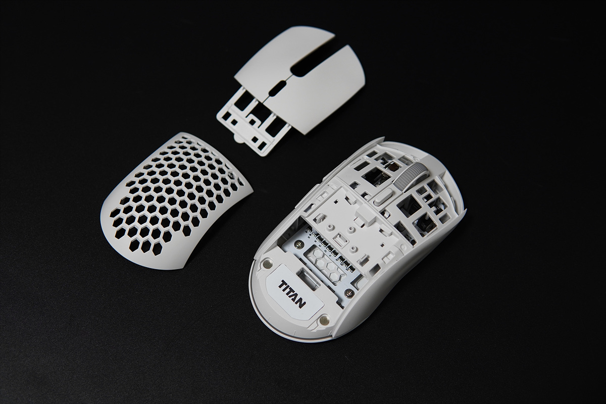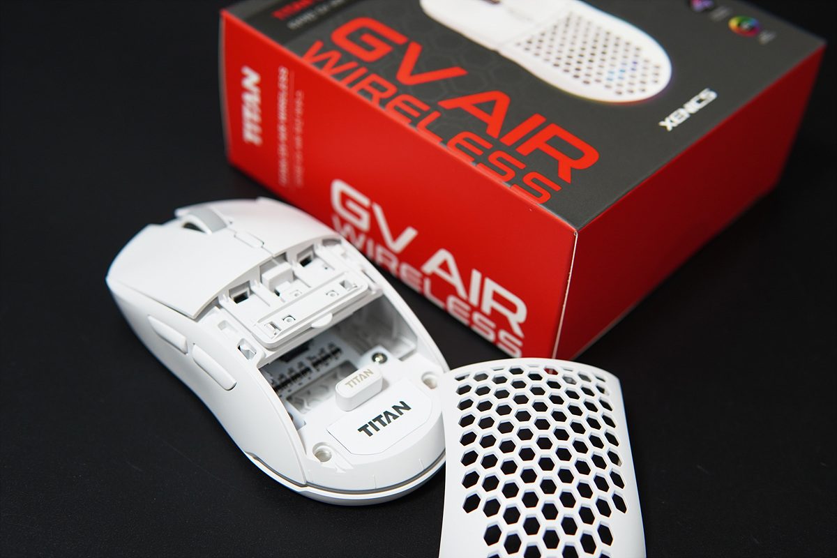 TITAN GV AIR는 좌우 대칭형으로 되어 있지만 왼쪽의 엄지 버튼이 있는 오른손 전용 마우스입니다. 교체할 수 있는 팜 커버뿐 아니라 마우스의 쉘(shell) 내부에도 타공이 되어있어서 전체적으로 무게를 많이 줄였습니다. 이번에 GV와 같이 출시되는 GE 제품이나 일부 유선 제품들은 측면까지 타공이 되어있습니다.