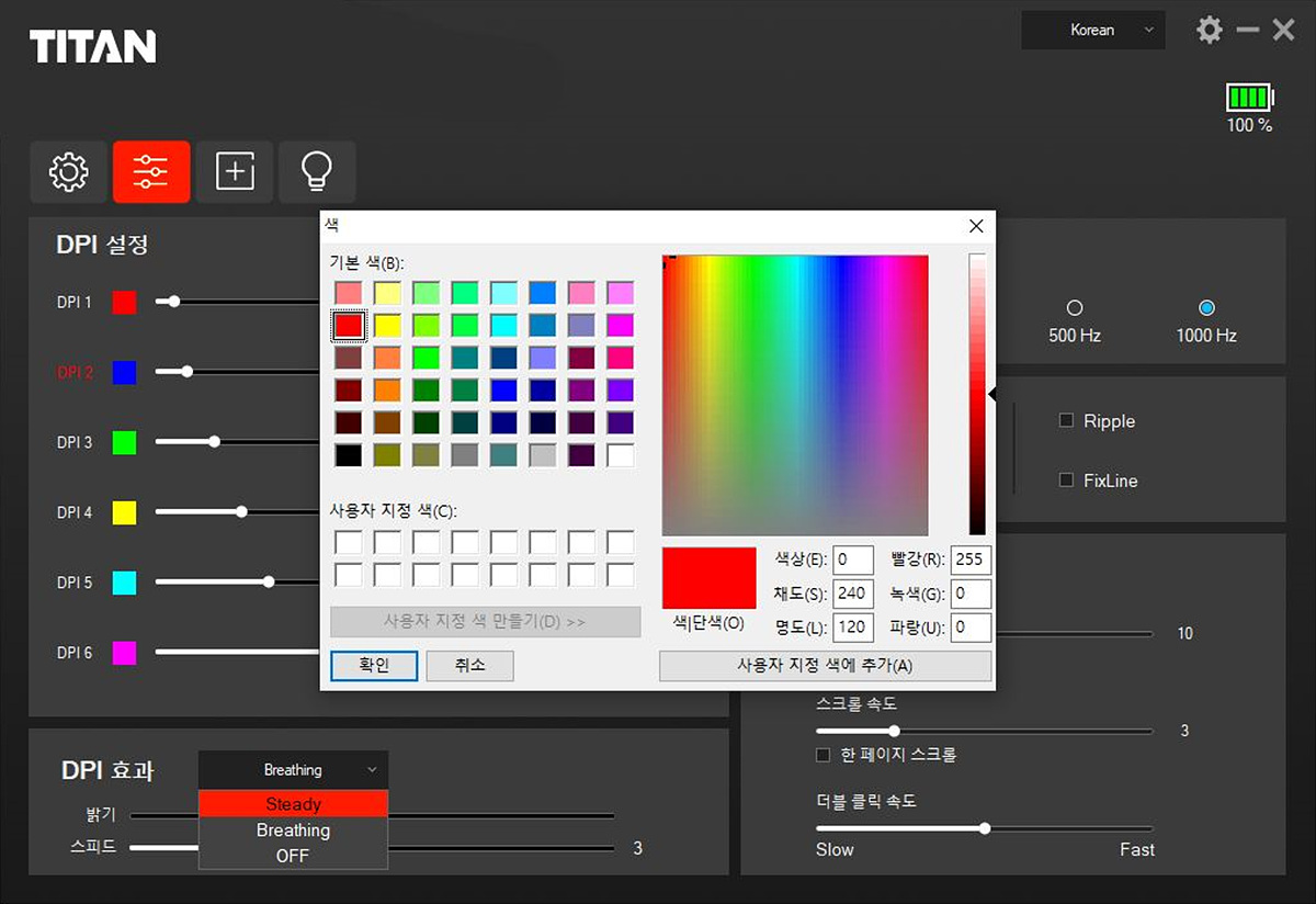 6단계의 DPI에 따른 색을 사용자가 임의로 선택할 수 있습니다. (TITAN 로고)
