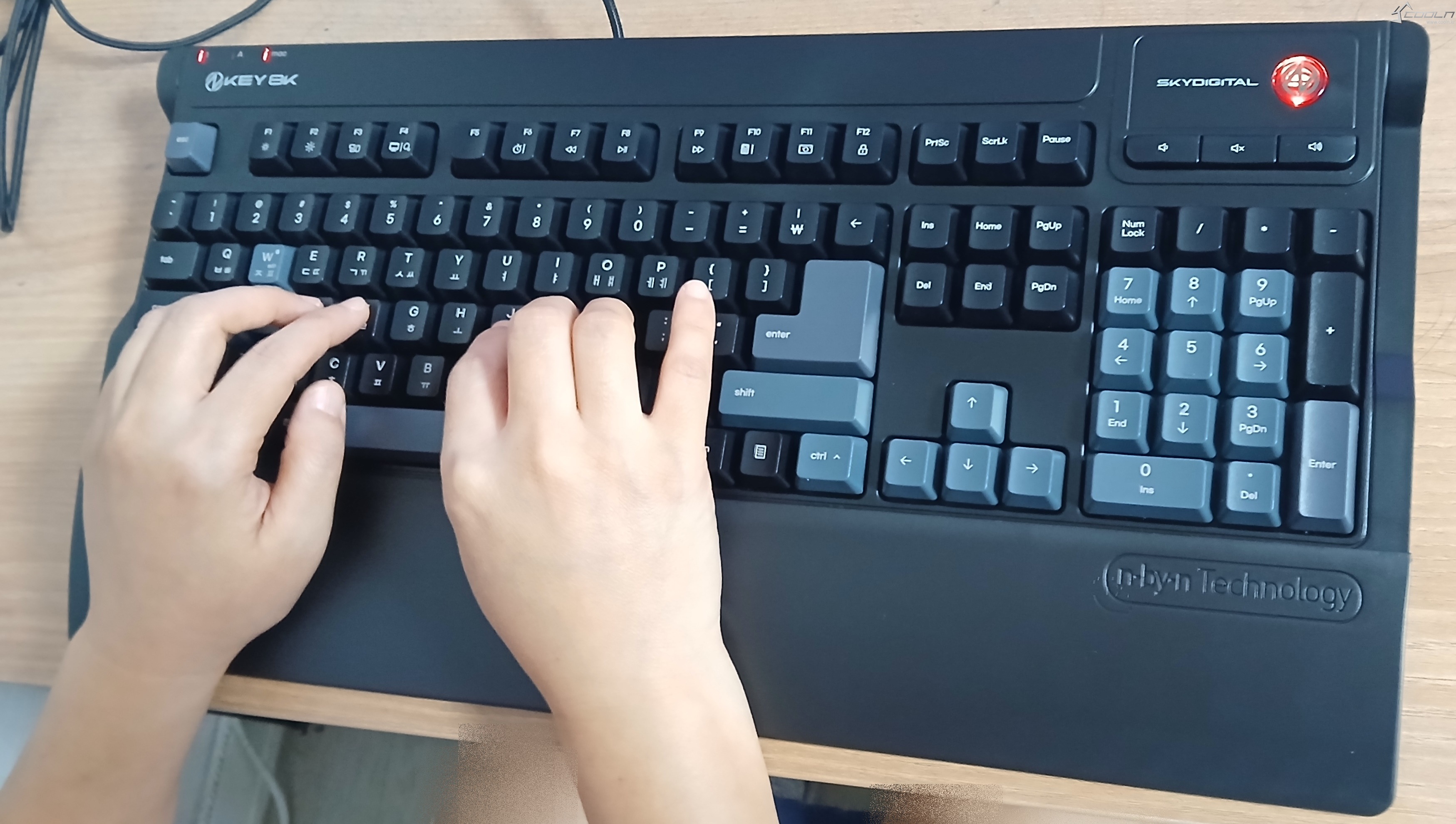 '스카이디지탈 NEKYBOARD NKEY 8K 게이밍 키보드' 타건 느낌은 편안함이었습니다. 그런데 독특한 점은 키보드 타건이 멤브레인의 편안함을 가지면서 소리는 약간 기계식 처럼 들리는 점 입니다. 요즘은 보기 드문 옛날식 멤브레인 키보드의 딸깍거리는 소리입니다. 즉 스카이디지탈 NEKYBOARD NKEY 8K 게이밍 키보드의 타건은 편하면서 적당한 타건음이 나므로 키를 치는 맛이 있습니다.