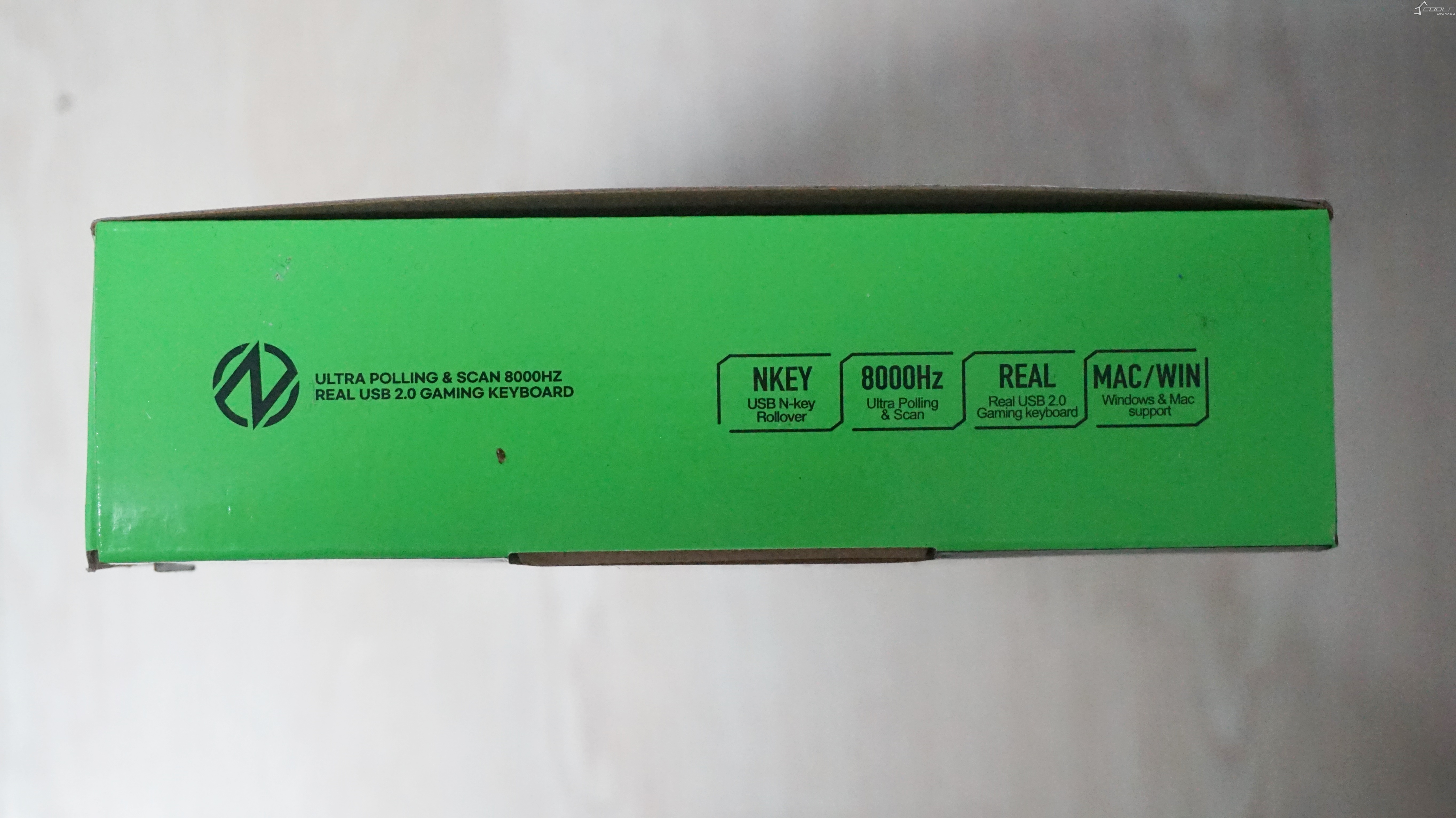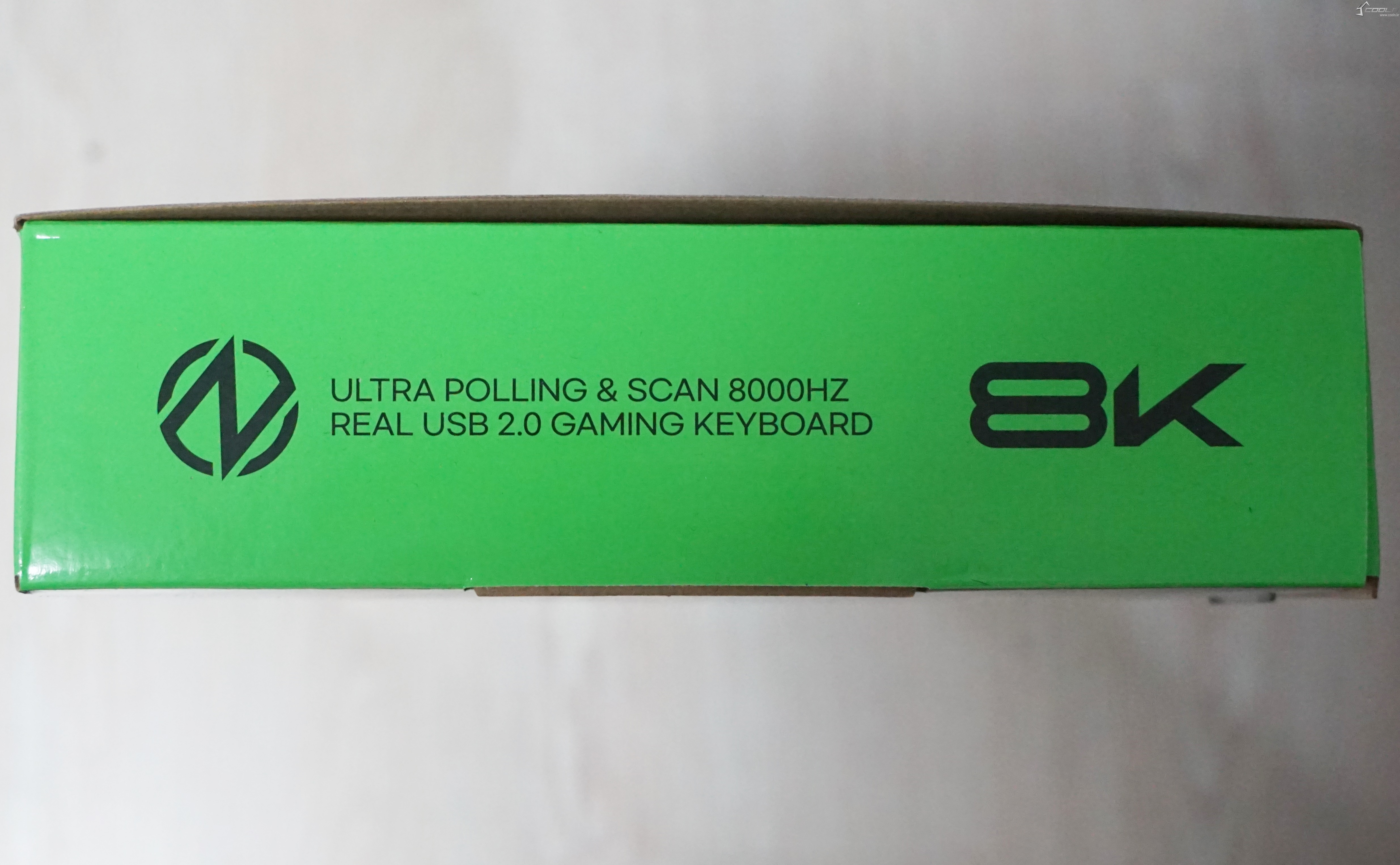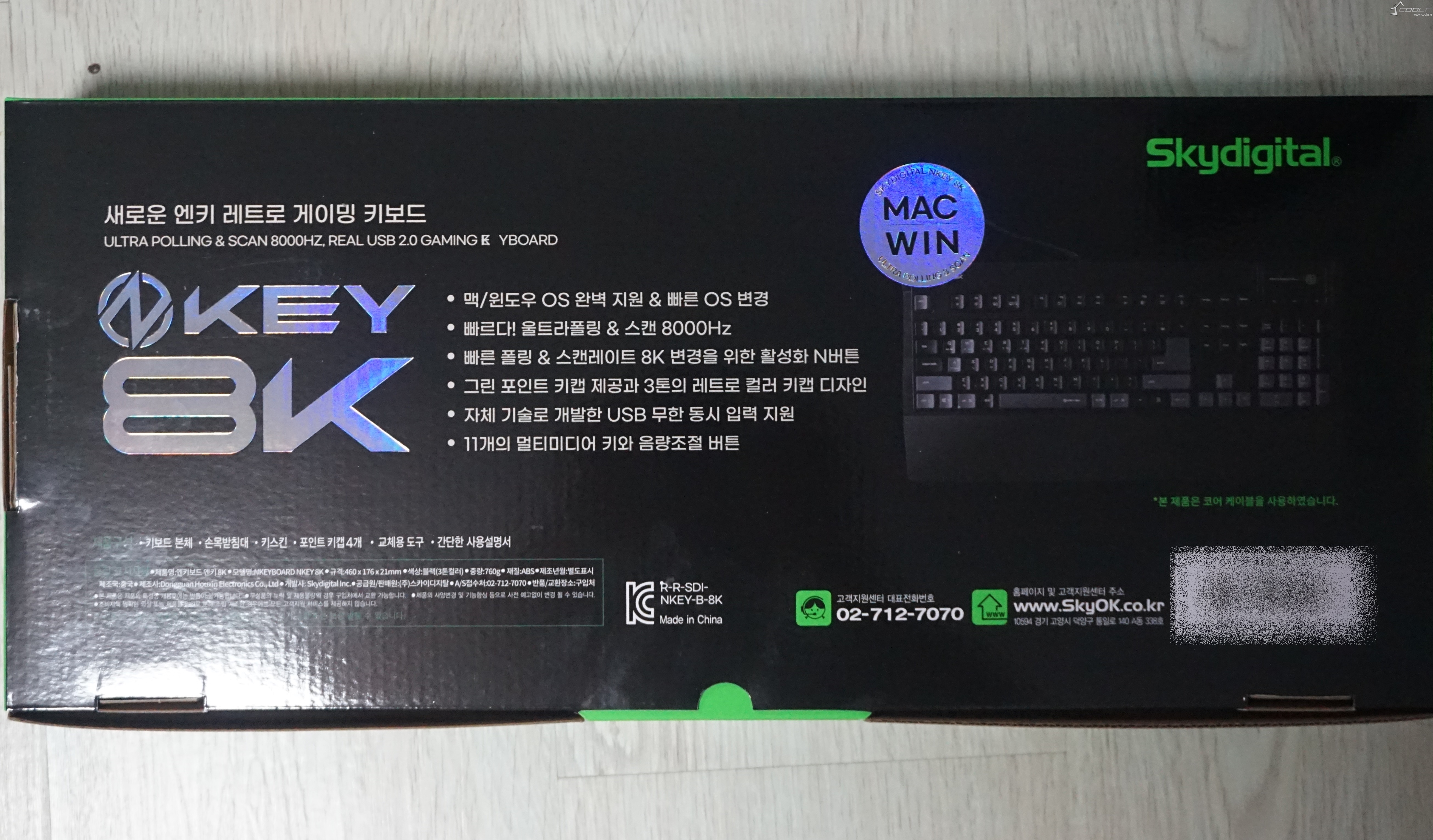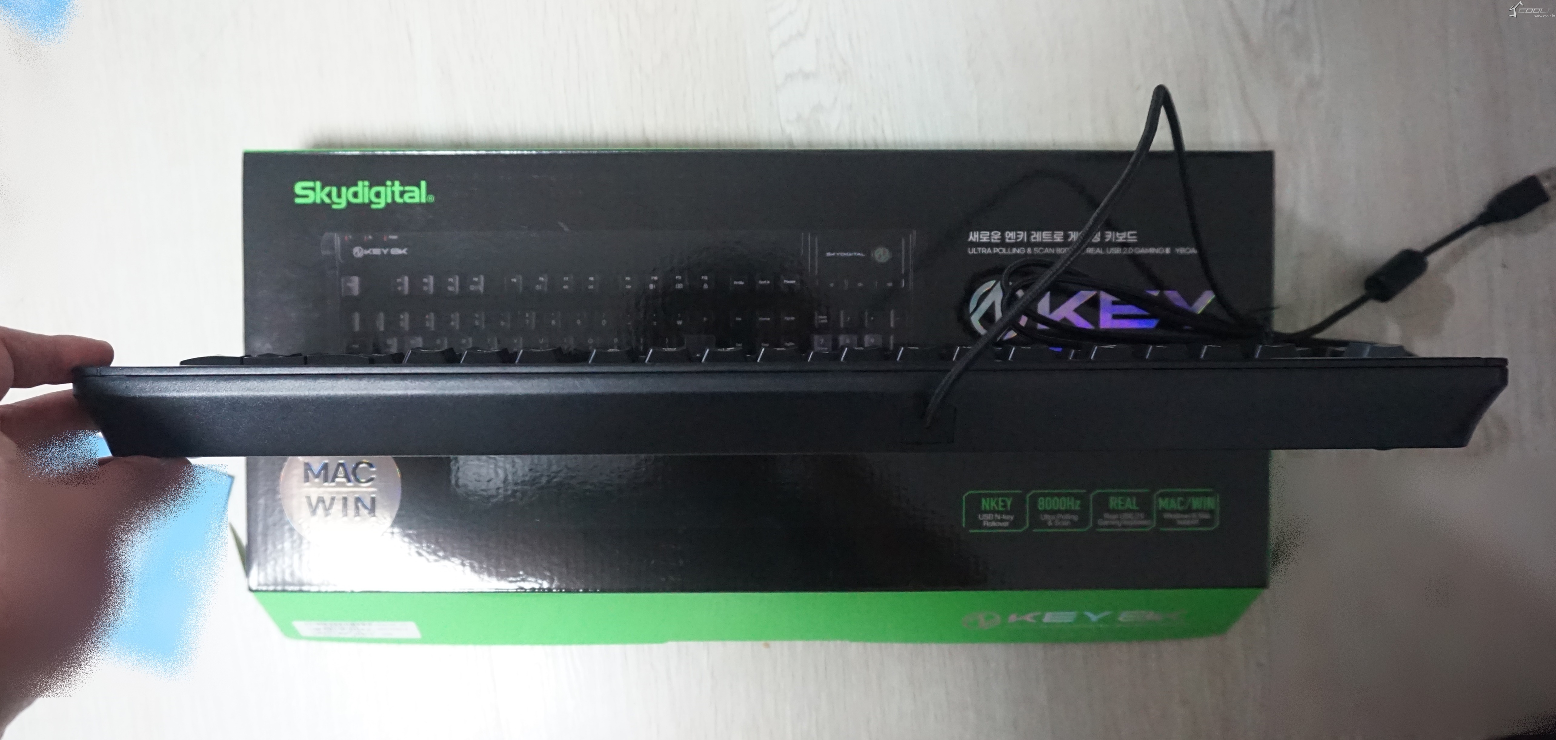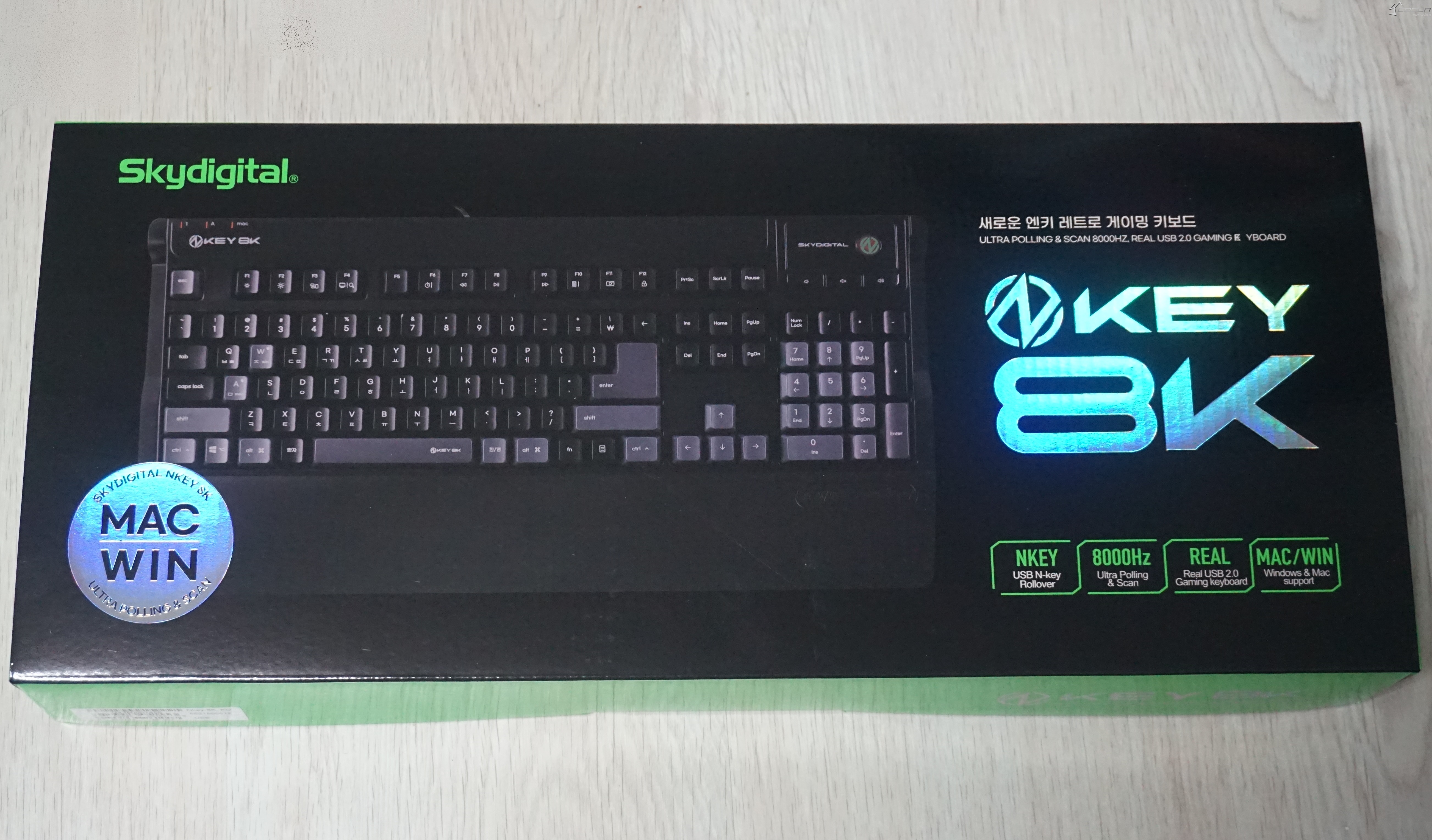 '스카이디지탈 NEKYBOARD NKEY 8K 게이밍 키보드' 의 제품 박스는 간만에 보는 유광제품의 박스 입니다. 최근 키보드 박스들을 보면 무광 재질을 거의 사용하는데 간만에 유광 재질인데다가 MAC/WIN 스티커와 NKEY8K 표시도 예사롭지 않습니다. 검은색 바탕에 녹색을 적절히 섞어서 스카이디지탈 로고의 이미지도 제대로 인식시켜주고 있습니다. 전체적으로 군더더기 없는 표시를 하면서도 굉장히 화려한 이미지를 주는 잘 만들어진 박스입니다.