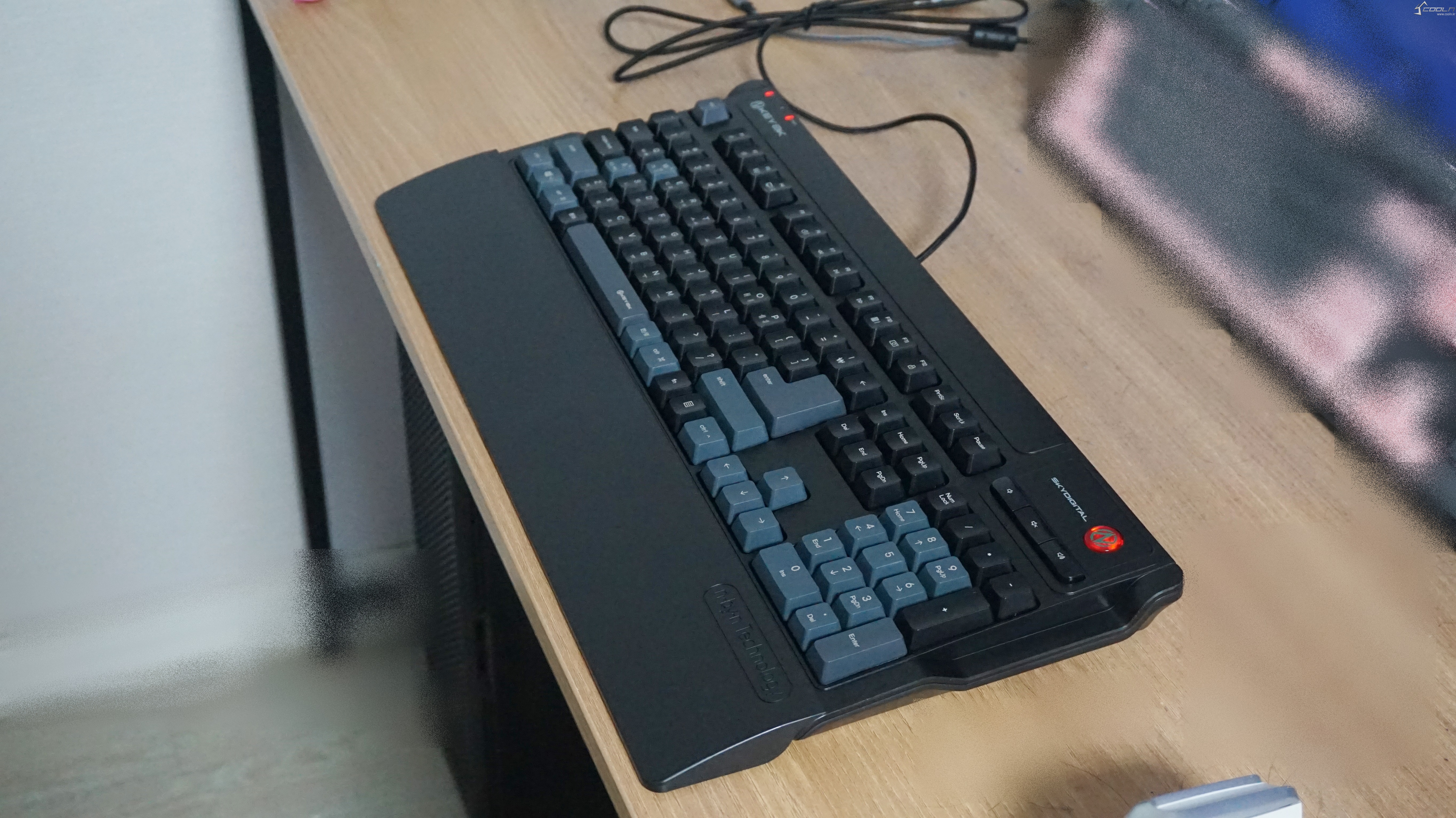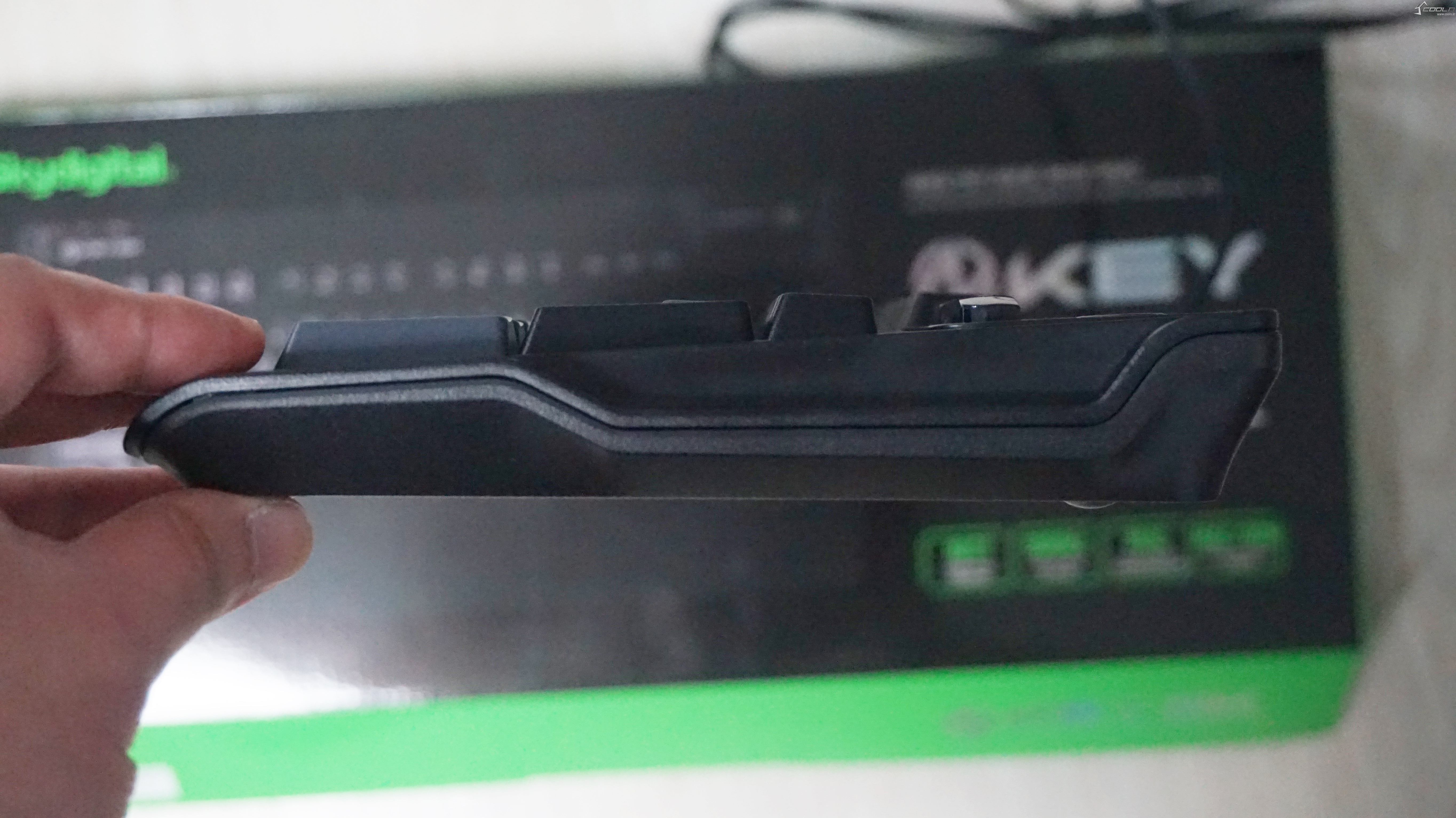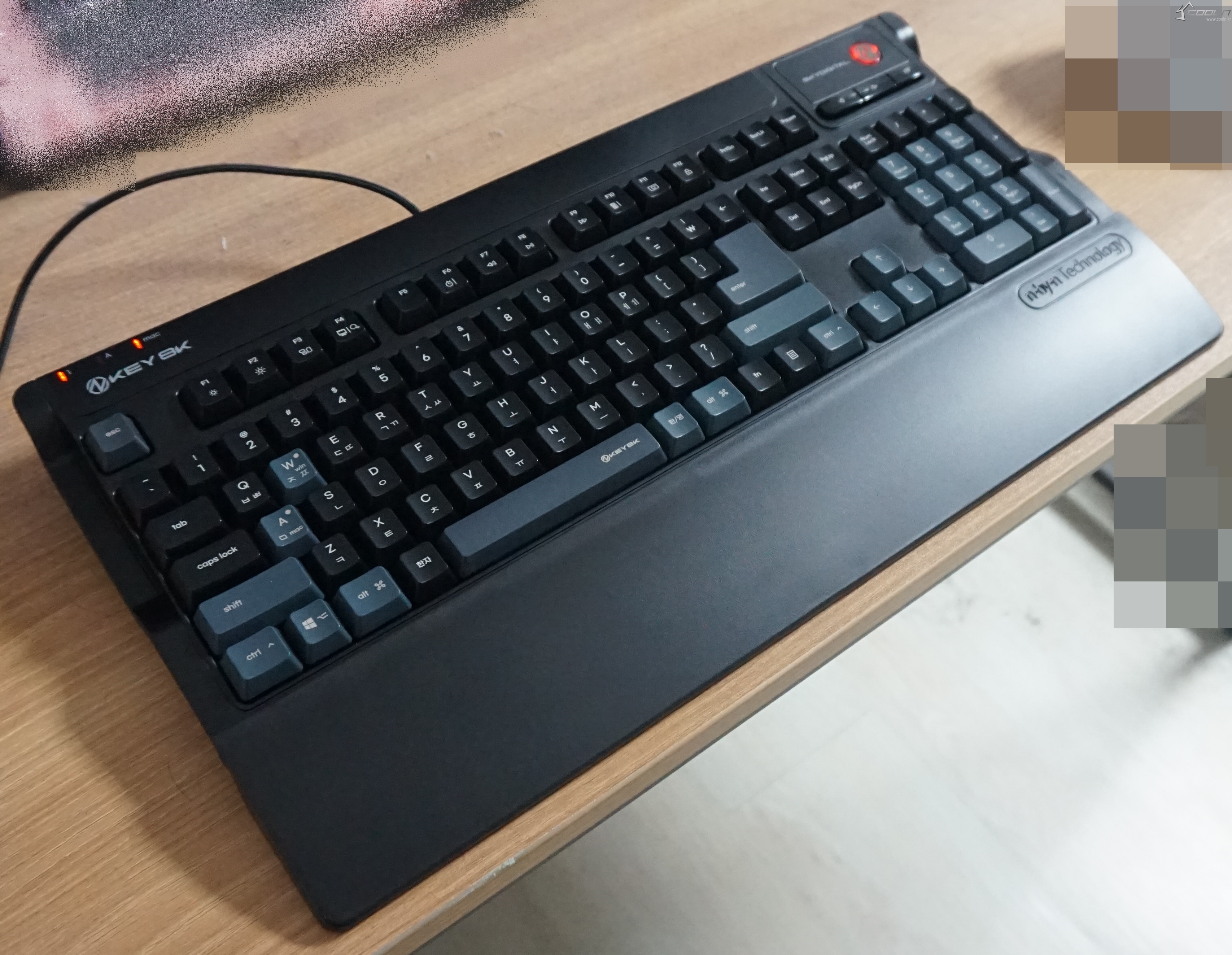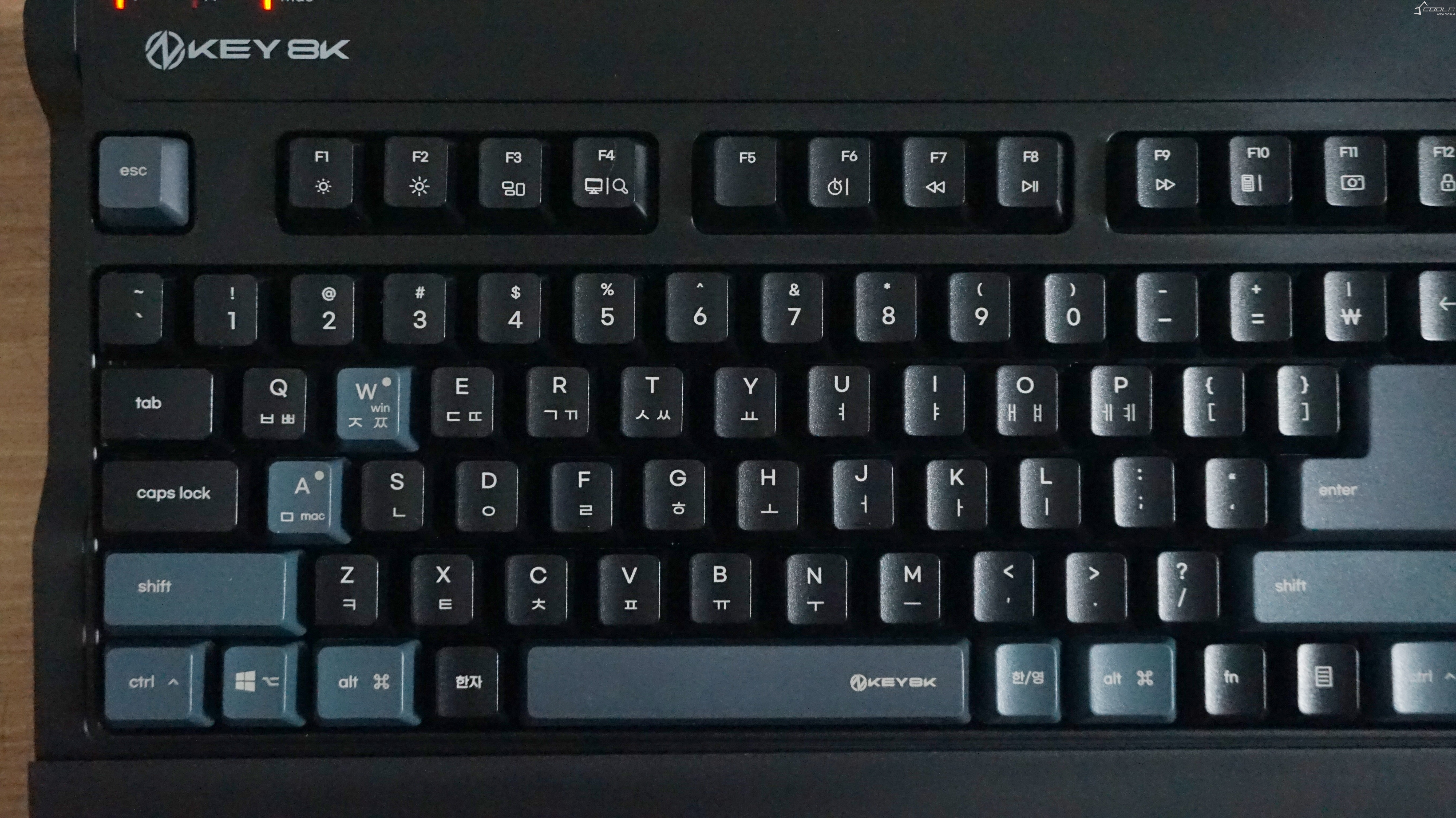 위의 디자인에서 분석 했듯이 상판이 일반 제품에 비해서 큽니다. 그리고 왼쪽 상단에는 인디케이터, 오른쪽 상단에는 8K 전환 버튼과 볼륨조절 버튼 3개가 있는 점이 일반적인 키보드와 다른 상판의 디자인입니다.