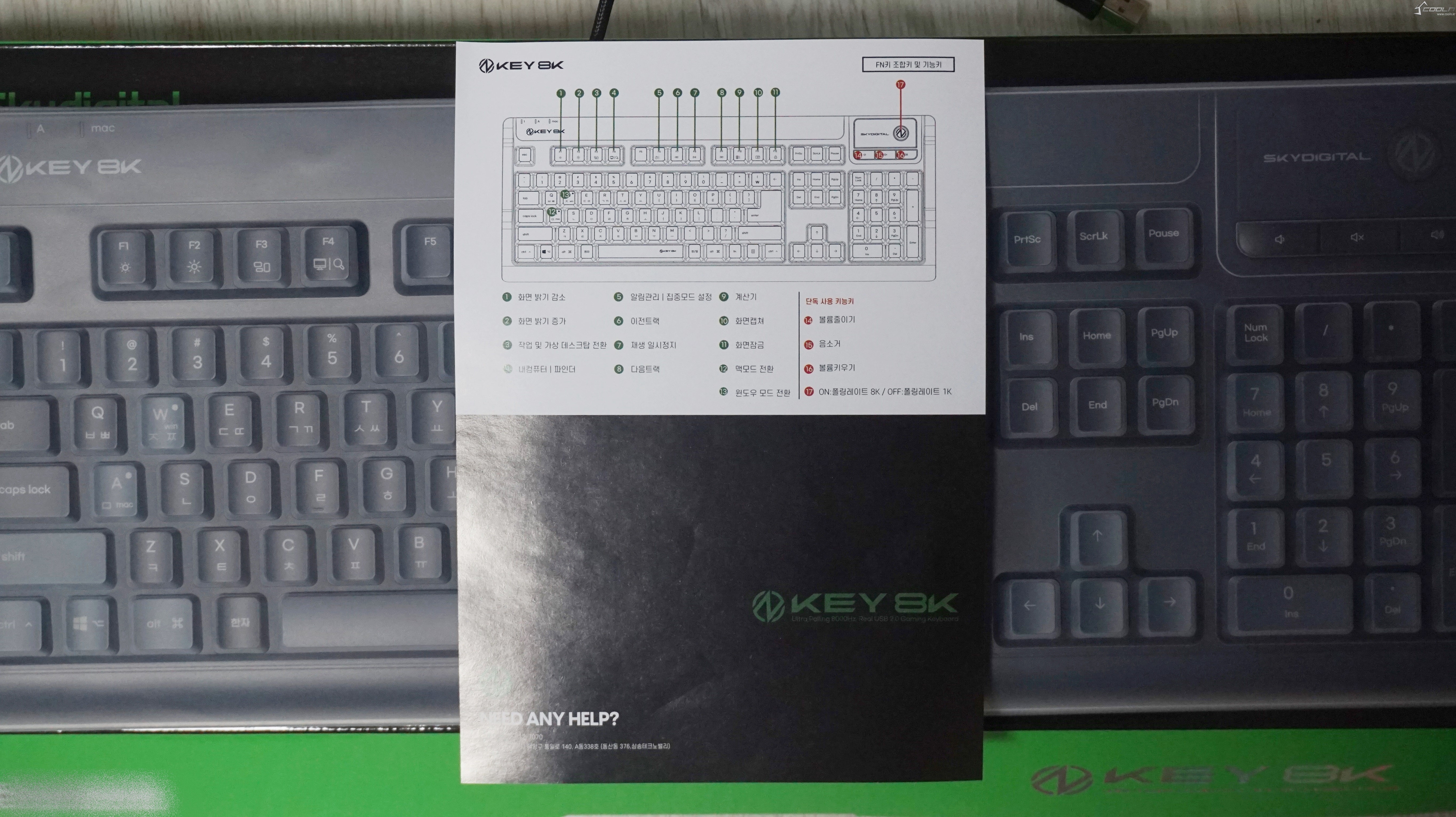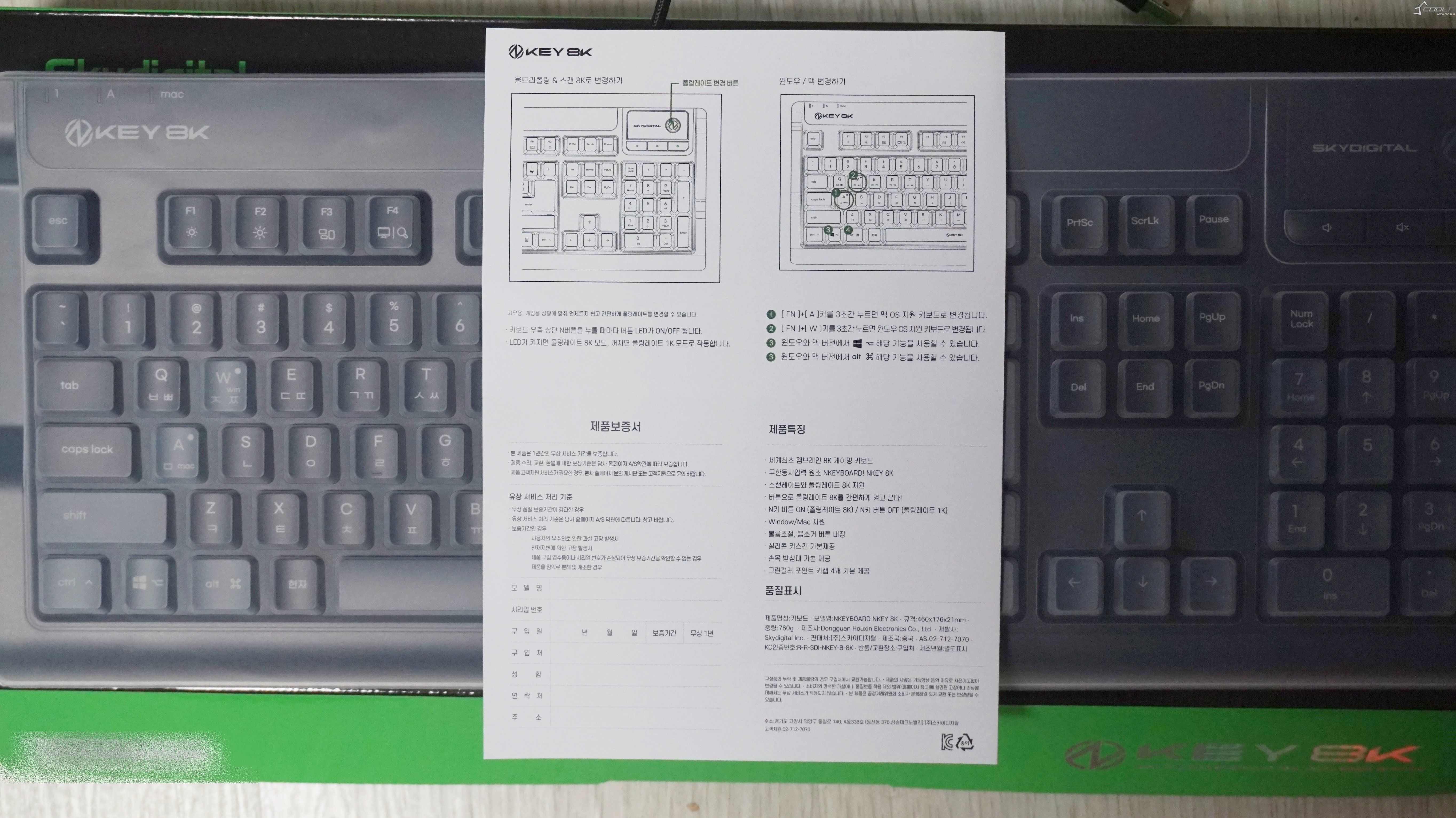 '스카이디지탈 NEKYBOARD NKEY 8K 게이밍 키보드' 구성품은 한장의 간략 설명서와 키스킨, 손목 받침대, 빨간색과 녹색의 포인트 키캡, 키캡 리무버로 구성되어 있습니다. 한장의 간략 설명서는 스피디하게 키보드를 사용하기 좋게 꼭 필요한 기능에 대한 설명을 잘 하고 있습니다. 요즘은 점점 보기 드물지만 있으면 좋은 키스킨도 들어있고, 상당히 편한 손목 받침대도 들어 있습니다. 빨간색과 녹색의 포인트 키캡을 활용해서 키캡을 교체할수도 있도록 키캡이 들어 있습니다. 구성품이 상당히 알차게 되어 있습니다.