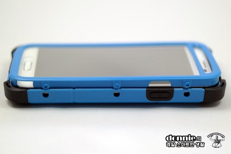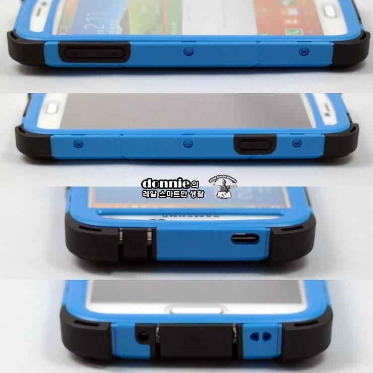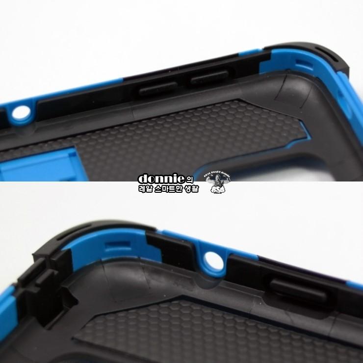 측면의 전원버튼, 볼륨버튼은 TPE로 덮혀 있지만 누르는 느낌이 나쁘지 않고 상단의 이어폰 단자와 하단의 전원포트도 TPE 덮개로 안전하게 끼워지며 덮히게 되어 있습니다. 그리고, 하단에 핸드폰줄 같은 스트랩을 연결할 수 있는 돼지코 같은 구멍이 보이죠.