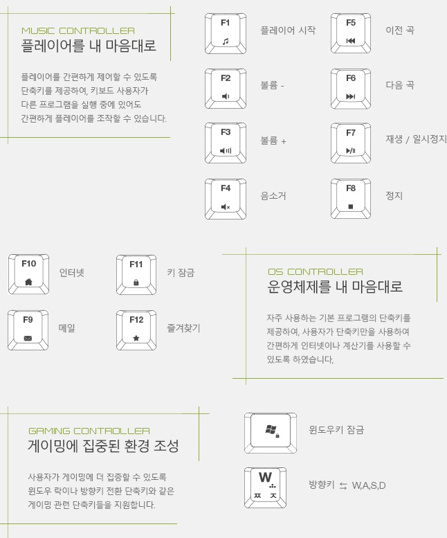 음악감상과 영화감상등 사용자의 편의성을 위한 멀티미디어 단축키와 게이머를 위한 단축키.