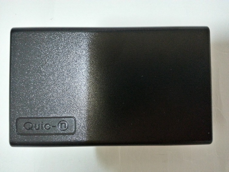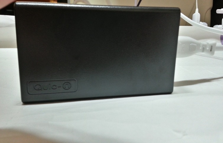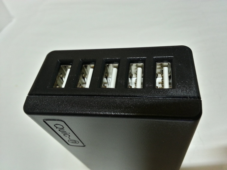 전면 좌측하단에 QUic-n 이라는 로고를 기준으로 좌측면에 USB 포트 5개가 있고 우측면에 전원연결 포트가 있습니다.