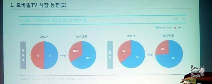 2012년만 해도 전세계 모바일tv의 영상 트래픽 비중은 비 모바일과 비슷한 정도였는데 불과 5년 후인 내년엔 66.5%까지 커질 것이라고 합니다. IT 강국인 우리나라는 훨씬 더 심한데요. 2012년은 64%에서 내년엔 74%를 예상한다고 합니다. 저만해도 TV를 통한 IPTV 시청 보다는 컴퓨터를 하며 동시에 태블릿PC로 모바일TV를 훨씬 많이 보기 때문에 이 수치가 수긍이 가네요.