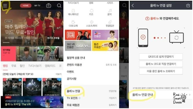 올레tv의 채널 742번에서 TV에 내 폰 연결을 실행하거나 위처럼 올레tv모바일에서 메뉴 버튼을 눌러 올레tv연결을 3가지 방법으로 할 수도 있습니다.