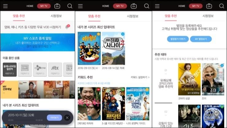 HOME, MY TV, LIVE 채널로 나뉩니다. 이에 대해서는 다음 리뷰 때 보다 자세히 설명드릴텐데요. 저도 라이브 TV와 TV VOD 서비스를 자주 이용하는데 5천원짜리 월정액 서비스만 이용해도 볼거리가 참 많습니다.