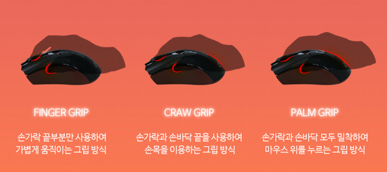 그립이란 것은 마우스를 어떻게 잡는가를 뜻하는데 그림을 보면 그립의 종류를 알 수 있습니다.