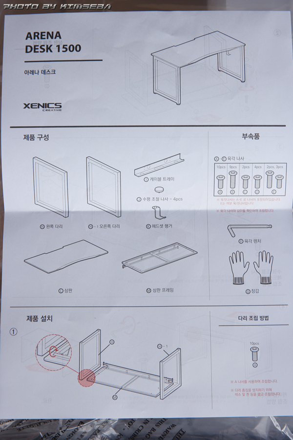 첫번쩨 박스를 다뜯고 구성품을 확인해봅니다. A~E까지의 나사, 육각렌치 1개, 높이조절 다리 4개, 헤드셋걸이 1개, 다리2개, 프레임 1개, 장갑, 케이블가이드 1개까지 누락된것 없이 모든 구성품이 정확하게 있습니다.