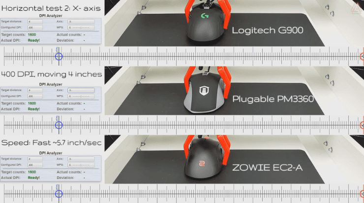 X축 좌에서 우로 이동을 했을시 로지텍의 3366의 경우 +0.44%의 편차를 보여 줬으며, Plugable 의 3360의 경우 +7.06%의 편차가 있었습니다. 마지막으로 3310을 사용한 EC2-A의 경우 -2.83%의 편차를 기록하며 3310보다 상위 센서로 분류되는 3360보다 더 낮은 편차를 기록합니다.