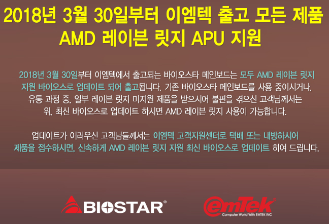 ▼ 이렇게 이엠텍에서 레이븐릿지를 지원하는 바이오스를 업데이트해서 출고합니다.