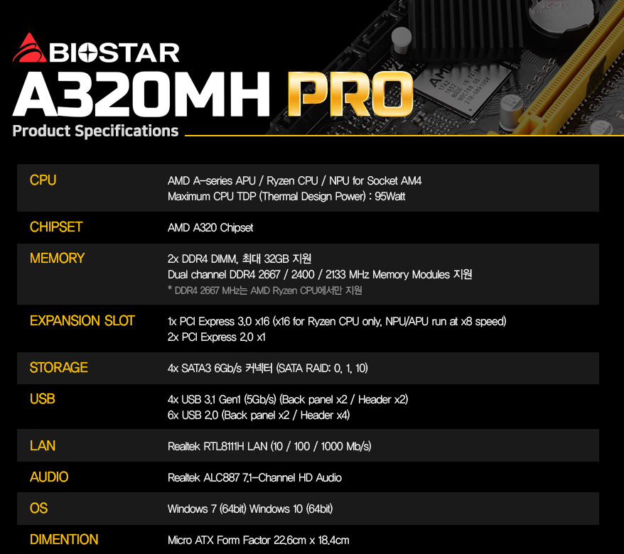 ▼ BIOSTAR A320MH PRO 사양
