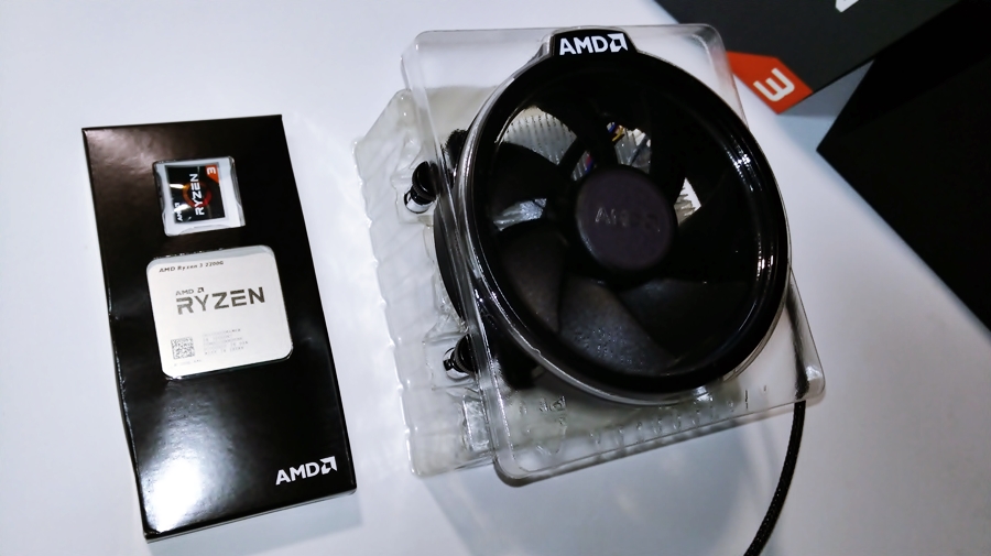 RYZEN3 2200G CPU와 스티커(라이젠 및 베가) 그리고 설명서가 들어 있는 상자