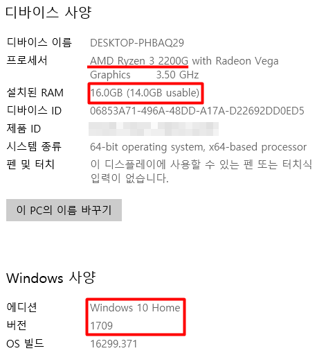 레이븐릿지는 윈도10 RS3 1709 이상 버전에서만 사용 가능합니다.