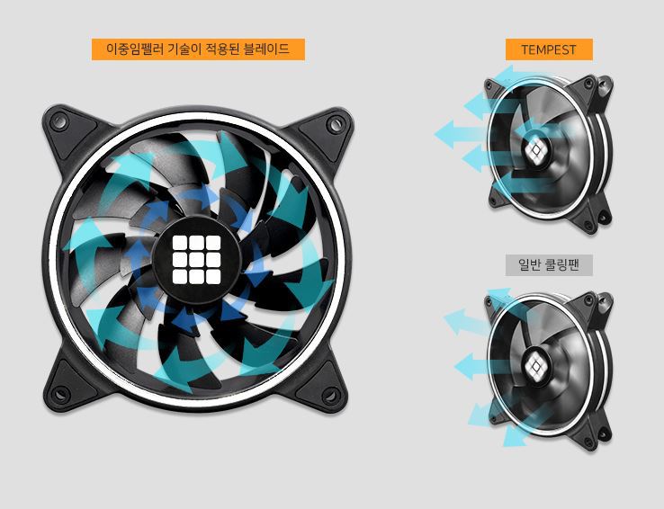 '마이크로닉스 TEMPEST2 쿨링팬' 에는 마이크로닉스 자체 기술력으로 설계된 이중임펠러 기술이 적용되어 있습니다.
