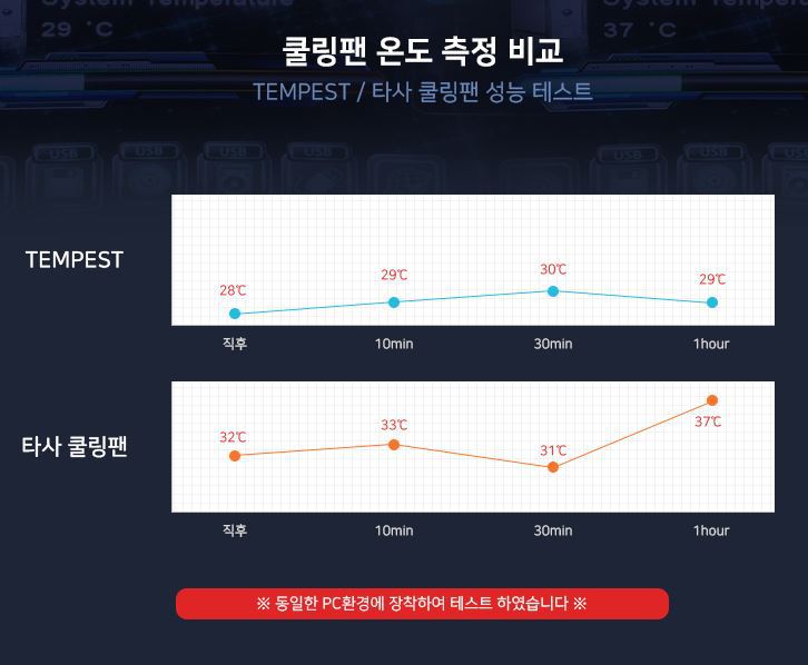 위와 같이 타사의 동급 쿨링팬에 비해서 온도도 낮고 변화가 없는 온도를 보여주고 있습니다.