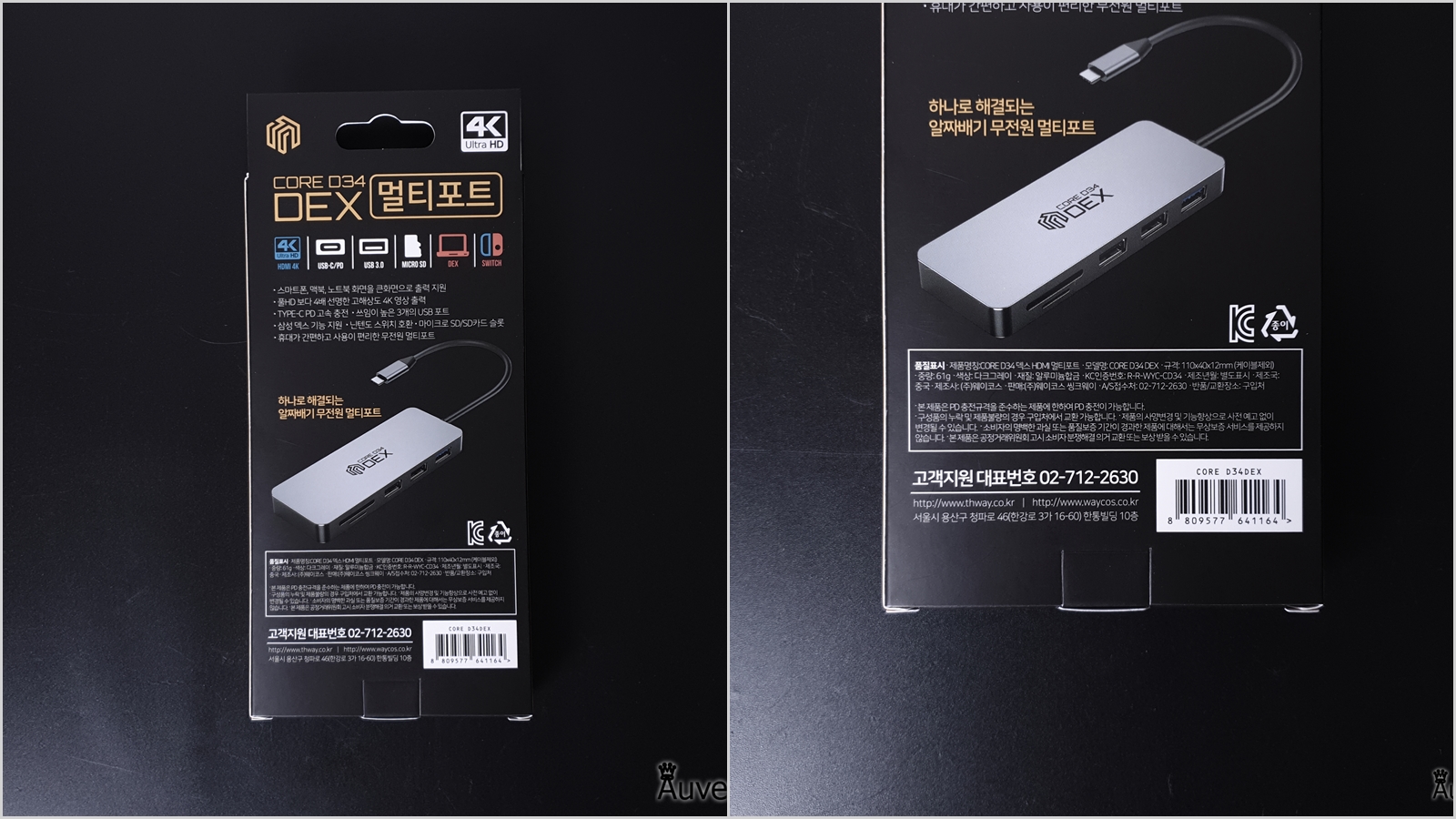 ▲ 씽크웨이 D34 멀티 허브의 패키지는 간단하게 제작되었습니다. 씽크웨이의 심볼이 전면에 인쇄되어 있으며, 검은색과 노란색의 투톤으로 디자인된 패키지가 사용되었습니다. 전면에는, 제품의 외형이 인쇄되어 있습니다.