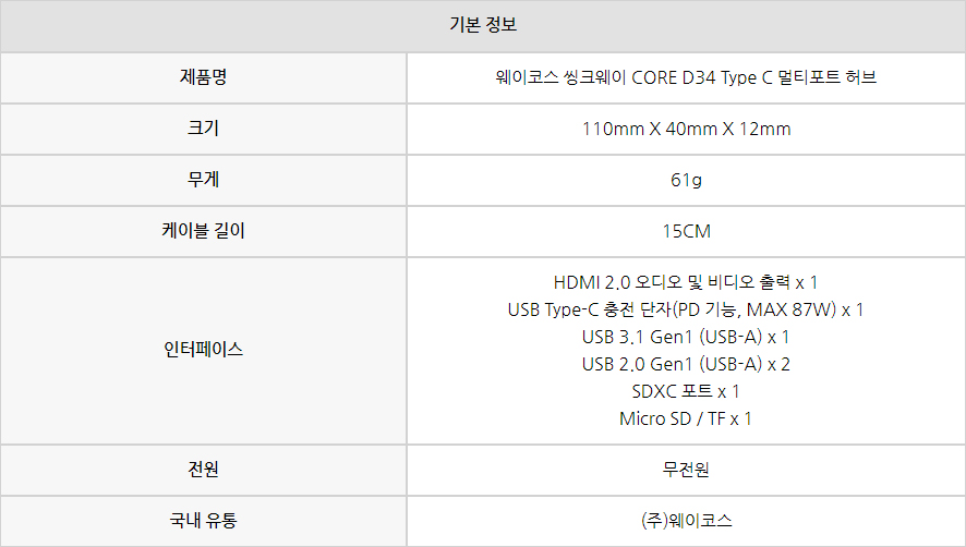▲ 패키지만큼이나 구성품도 간소한데, 구성품은 웨이코스 씽크웨이 CORE D34 Type C 멀티포트 허브 본체와 사용 설명서로 구성되어 있습니다.