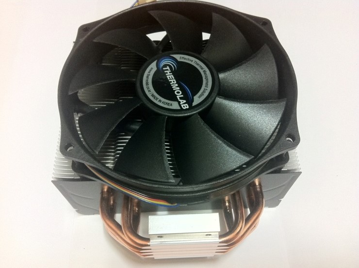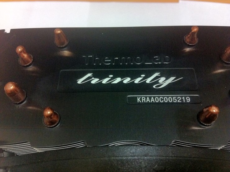 트리니티 쿨러의 모습입니다. 전면 130mm 쿨러가 장착되어있고 써모랩의 스티커가 붙어있습니다.