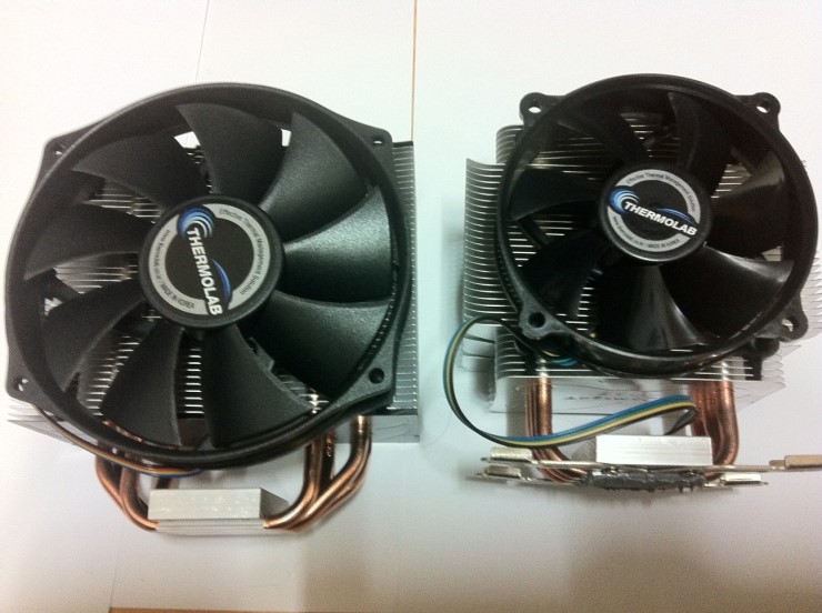 한눈에 보기에도 쿨러의 크기차이가 많이 납니다. 바람은 92mm 쿨러를 사용하였으며 트리니티는 130mm 쿨러를 사용하여