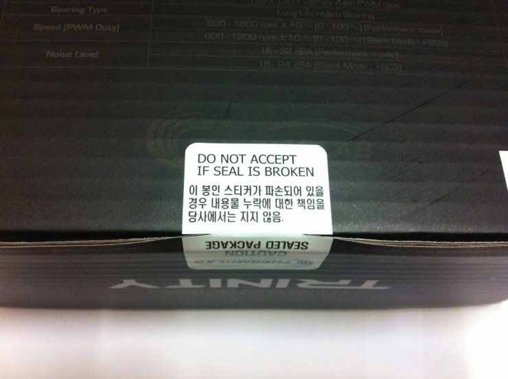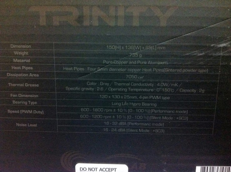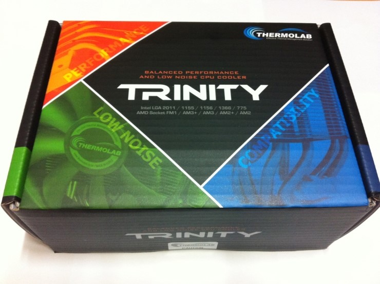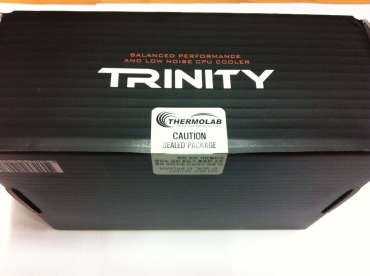 트리니티 CPU 쿨러 박스 입니다. 우측 상단에 써모랩의 로고와 함께 중앙에는 트리니티 제품명이 프린트 되어있고