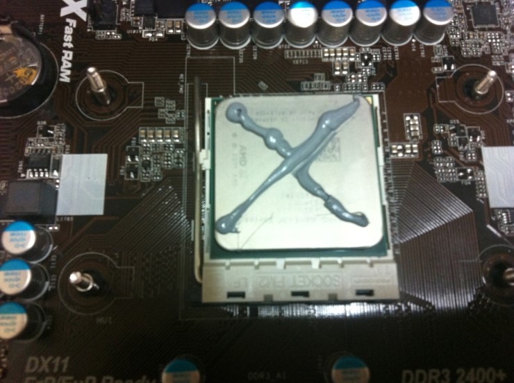 CPU에 번들 써멀그리스를 X자로 도포한 모습입니다. 양이 조금 많이 도포되었네요