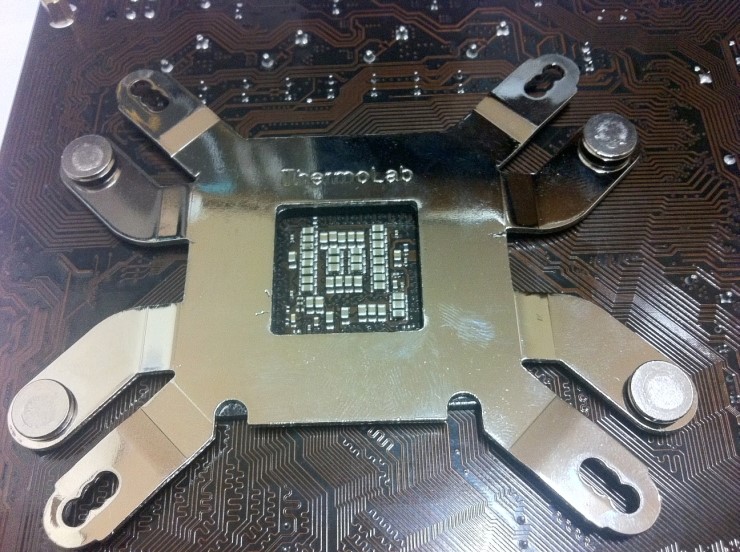 백플레이트를 메인보드 뒷면에 장착한 모습입니다. 써모랩글자가 보이도록 장착하셔야합니다. 뒷면에 장착시