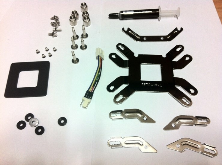 제품구성 품목은 좌측 위부터 LGA 2011 소켓용 양단 볼트가 5개 , 쿨러 고정용 손나사 5개 , 써멀 그리스