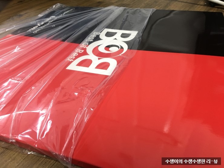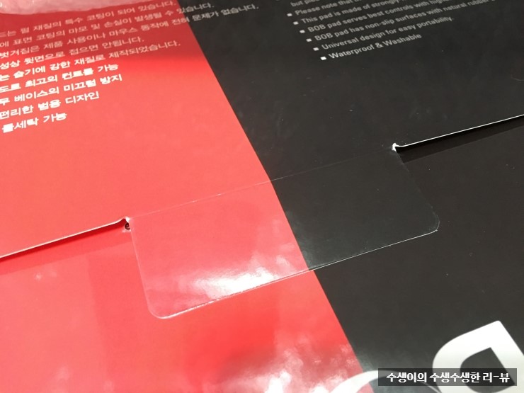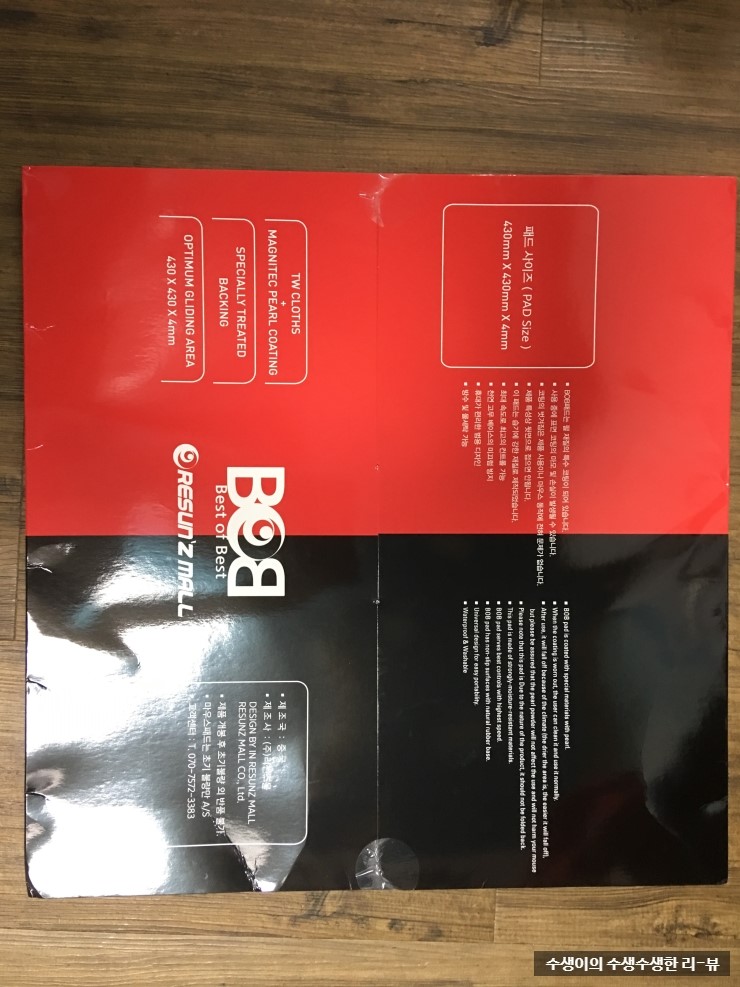 ㅣ앞면에는 BOB로고가 크게 써져있고 왼쪽에는 리썬즈몰 이라고 적혀있고 오른쪽에는 패드를 만져볼수있는 구멍이 있습니다뒷면에는 사이즈,주의사항(한/영),기타 정보들이 적혀있습니다. 박스에 적혀있는걸로 보아서 설명서는 따로 없어보입니다